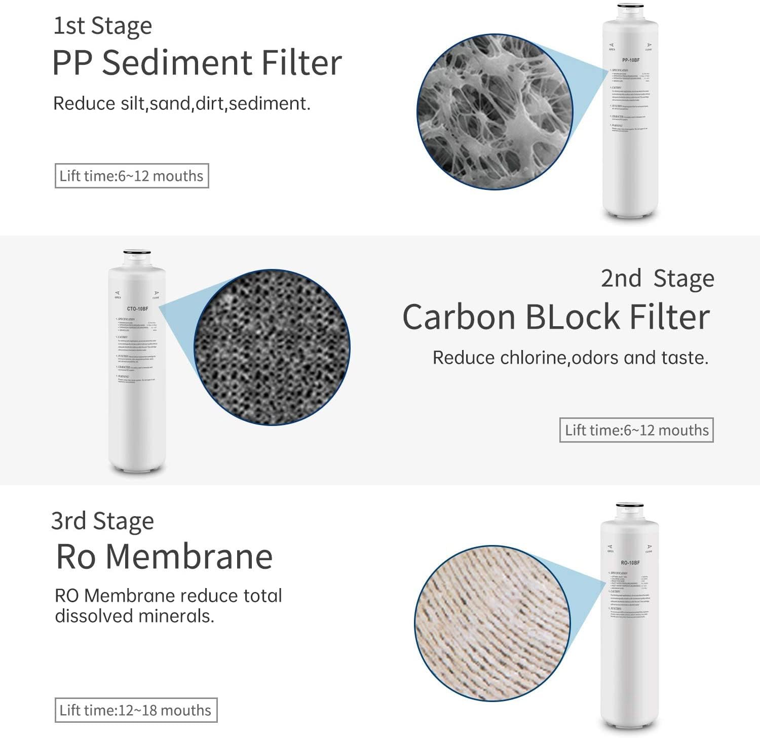 Specification: FEED WATER PRESSURE: No Requirement TEMPERATE:40-110°F/5-45°C PH:3.0 -11.0 MAX TDS :500 PPM TURBIDITY <1.0 NTU MAX SDI <4.0 HARDNESS<5 GPG IRON <0.1 MANGANSESE <0.05 Shelf life: 3 Years Warranty: 1 year limited warranty More valuable information: ✪What is 3 stage filters and function? the 1st stage: PP spun filter, Remove sand, dirt, sediment. the 2nd stage:Carbon filter, Remove chlorine, taste & odors, very fine particulates the 3rd stage:TFC Ro membrane, Reduce 99% total dissolved minerals, Arsenic, Mercury, Iron, lead ,Fluoride and 1000+ contaminants . ✪What is in the box? 3 Pieces replacement filters in the box, PP sediment filter, carbon filter and 75 GPD Ro membrane. ✪BPA free? Yes, BPA free and food grade materials. Note: 1.It Is Recommended to Wait Until the Entire System Is Pressurized and Re-Check for Any Leaks Before Leaving Installation Site. 2.It Is Normal for Some Black Carbon Fines to Appear in The Water When Emptying the First 2 Tanks of Water. The First 2 Tanks of Water Produced Should be Emptied and Not Used. 3.Please keep flush 30 minutes for new filters.
