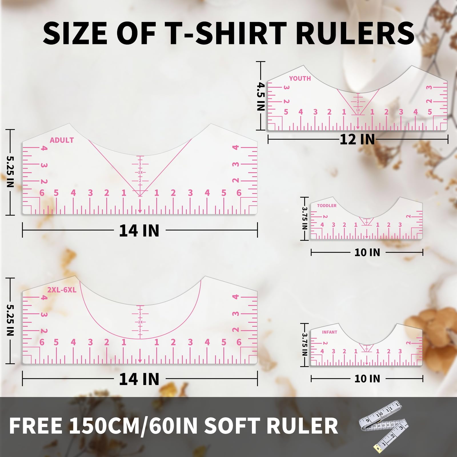 đăMeet Different NeedsăThe rulers comes with 4 Styles, they are applied to all kinds size: Adult, Youth, Children and V-Neck. The rulers have advanced UV printed graduated numbers and marks that are clearly visible on the ruler guide, they are easy to read against almost any shirt color. Measurement has made easier by inch marks on both side of this shirt measurement tool for vinyl set.