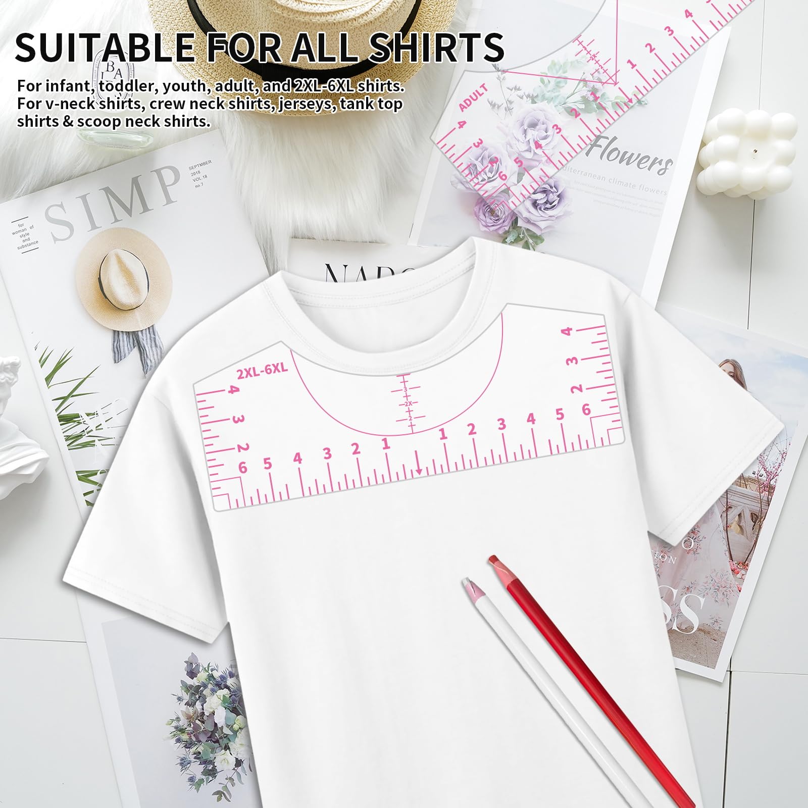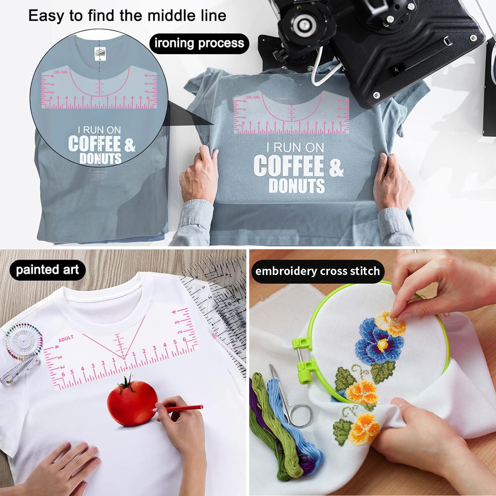 T-Shirt Ruler Alignment Tool Product Description This T-shirt ruler alignment tool is a practical accessory for DIY clothing making and decoration, specifically designed to solve the problem of inaccurate positioning during T-shirt printing, heat transfer, and embroidery. Crafted from durable materials, it features clear and precise size markings that help you quickly find key positioning pointsâsuch as the T-shirtâs center and the distance below the neckline. Whether for home DIY projects or small studio batch operations, it boosts positioning efficiency and enhances the overall aesthetics of finished products. It fits T-shirts of different sizes, can be easily stored after use, and requires no complicated adjustments, making it beginner-friendly. This tool is a must-have positioning aid for T-shirt decoration enthusiasts and handcraft creators.