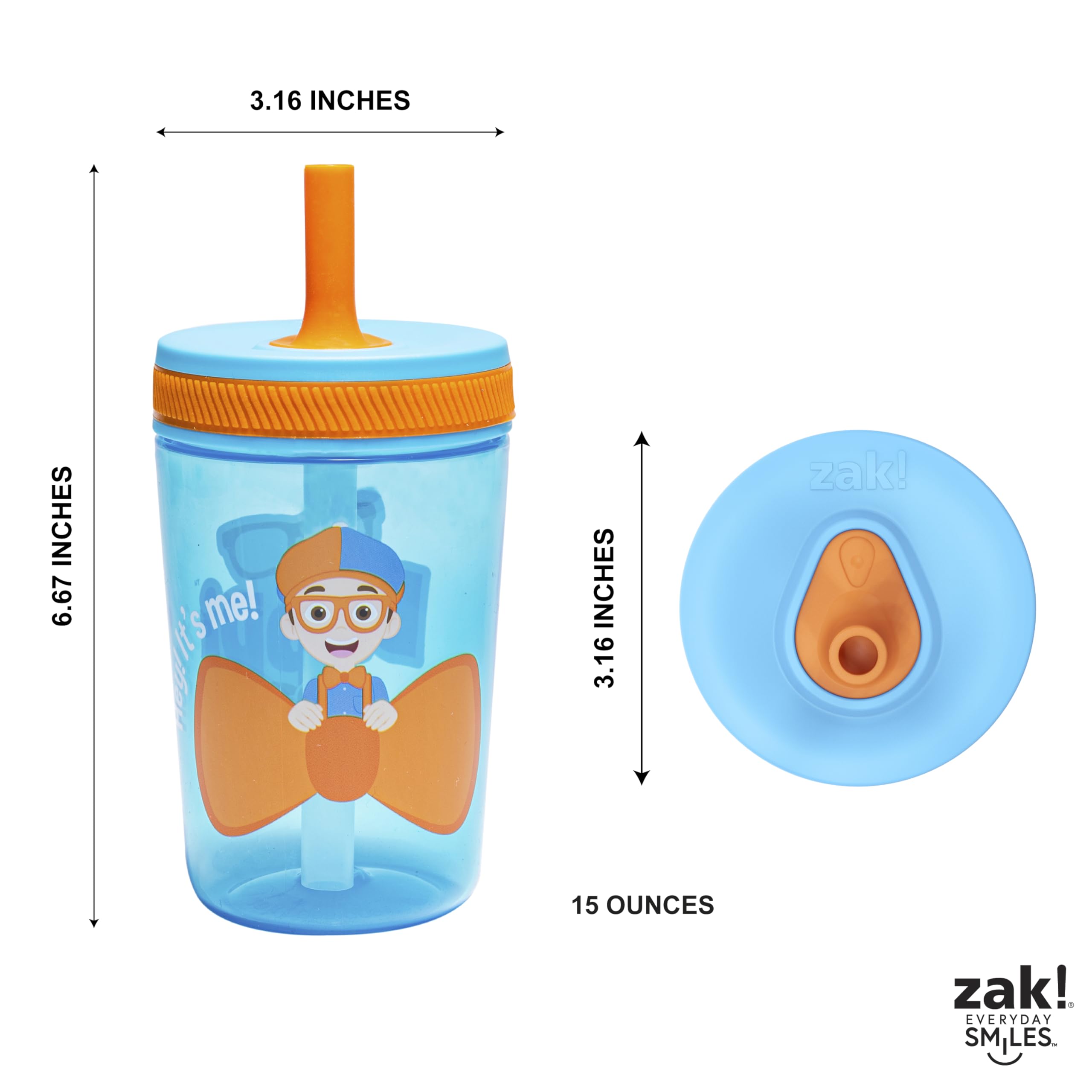 SIZE: The set contains two Blippi tumblers that are 3.16 inches in diameter and 6.67 inches tall. They have a capacity of 15 ounces.
