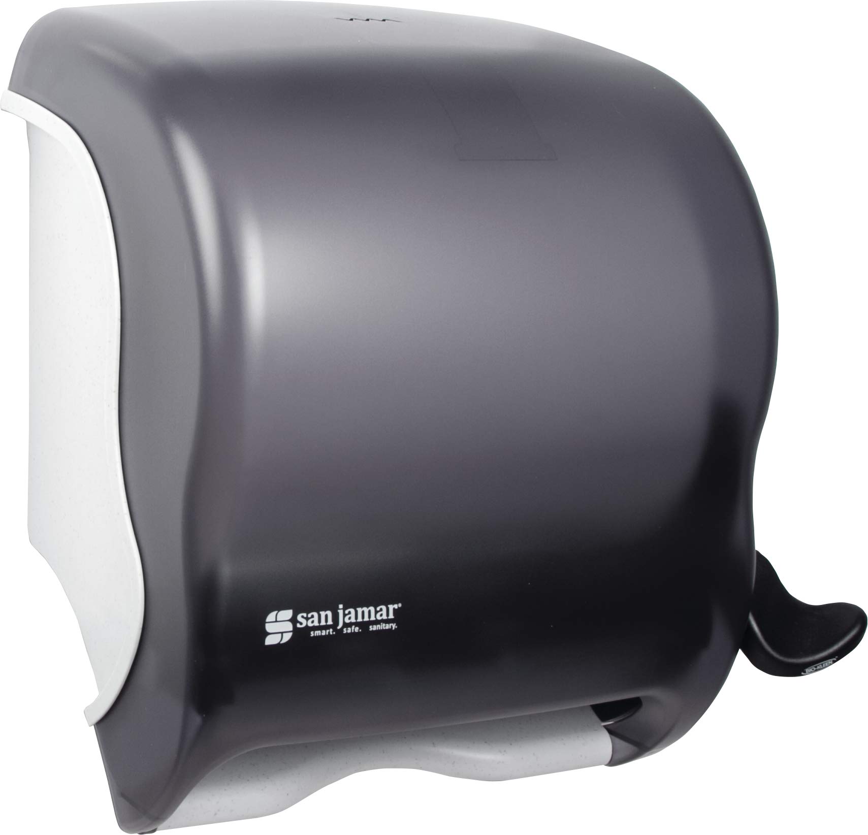 The San Jamar Classic Element Paper Towel Dispenser is the ultimate solution for your high-capacity paper towel needs in bathrooms, kitchens, and restaurants. This wall-mounted roll dispenser is designed to fit all core sizes, including coreless, solid, and centerpull rolls, making it a versatile choice for various paper qualities. Equipped with an ergonomic lever, this dispenser promotes easy and efficient towel dispensing while preventing wastage, ensuring cost-effectiveness and convenience. Its push dispenser mechanism ensures quick access to towels, ideal for high-traffic areas where efficiency is paramount. Crafted from durable plastic in a sleek black pearl finish, this dispenser combines functionality with a modern aesthetic, perfect for enhancing any restroom or kitchen space. Its universal design accommodates all types of paper towels, making it a practical choice for commercial settings like restaurants. (Model Number - T950TBK).