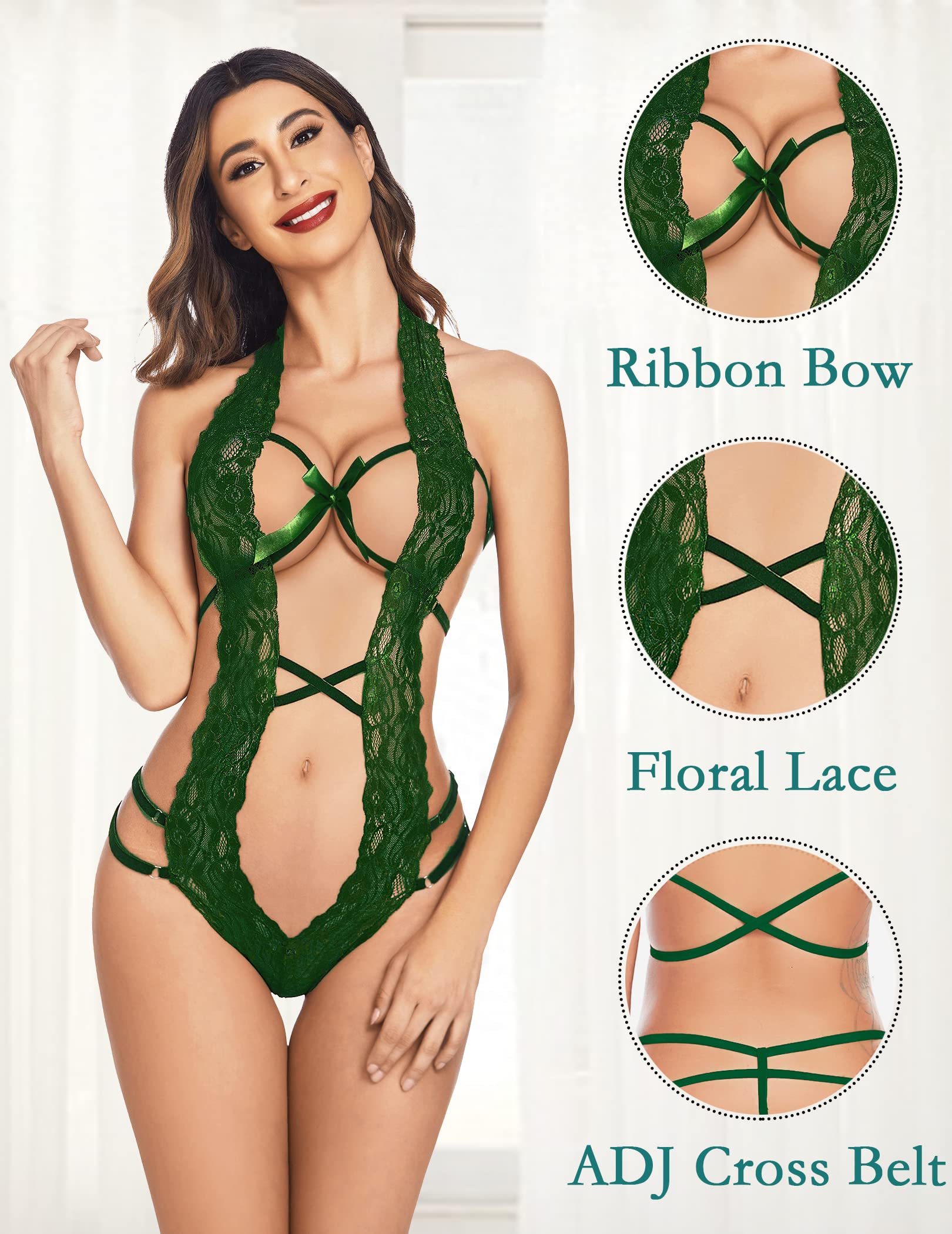 Women's plunging one piece lingerie lace teddies mini bodysuit features halter neck, lace-up front with bow embellishment, adjustable straps, g-string style bottom, and backless design