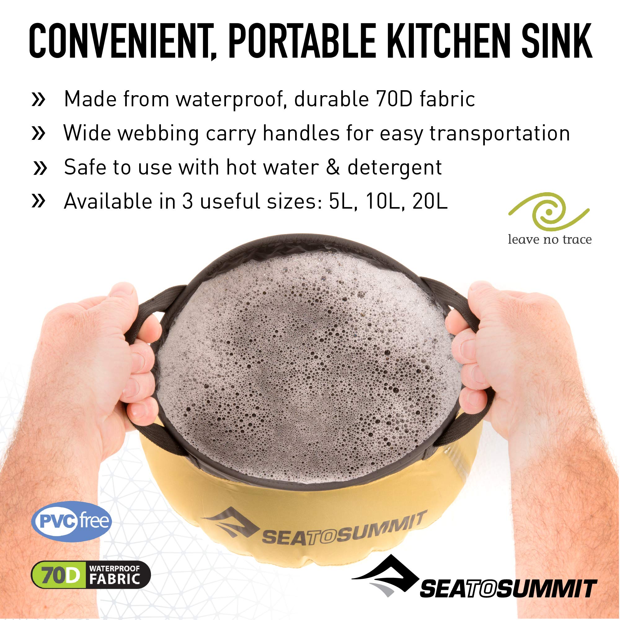 10-liter (2.6-gallon) sink measures 15 x 11 x 6 inches, packs to 5.5 x 1.75 inches, and weighs 4.7 ounces; PVC- and BPA-free