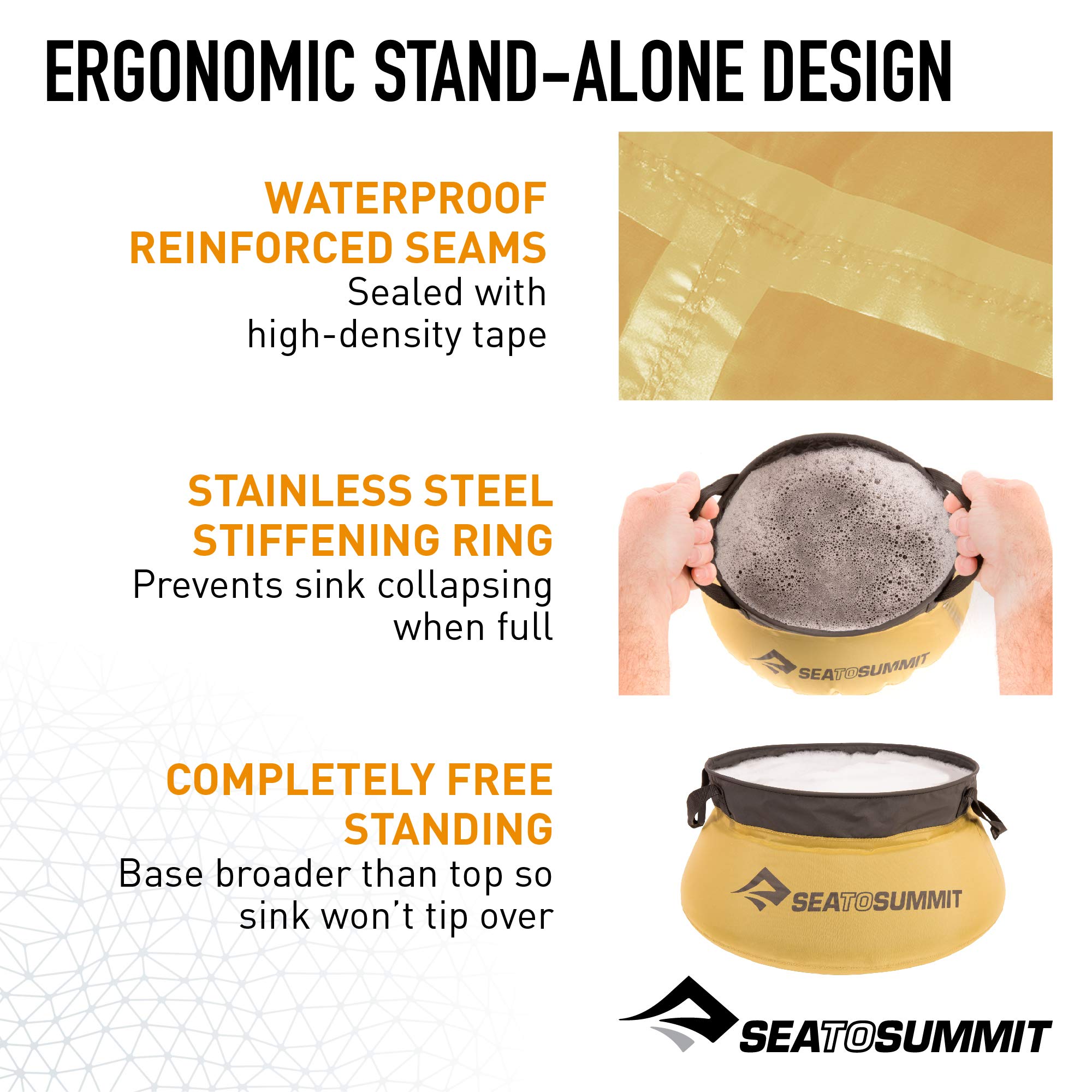 Free-standing when filled; wide base and stainless steel stiffening ring prevents the sink from collapsing when full