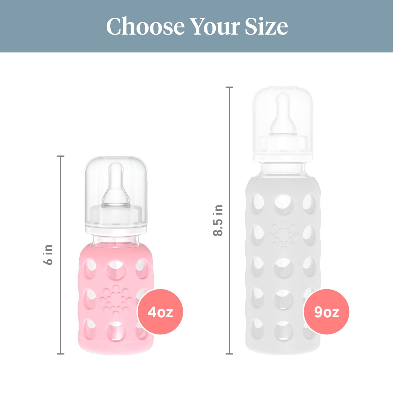 Product Description Our baby bottles are made of the highest quality, thermal shock resistant borosilicate glass. This allows our bottles to transition safely from freezer to boiling water. The silicone sleeves provide a good gripping surface for little hands and help protect against the occasional drop. Includes 4-ounce (120 ml) bottle with Stage 1 (0-3 mos) nipple. Care and Use -Before first use, place in dishwasher or in boiling water for 3 minutes. This is to ensure hygiene. Immediately after use, disassemble individual top components (e.g. nipple from top or valve from cap). All parts are dishwasher safe (top rack only). To wash by hand: wash separately in hot, soapy water and rinse thoroughly. Bottle and sleeve may be placed in the dishwasher or boiled without removal of the sleeve. If you wish to remove the sleeve, it comes off best in warm, soapy water. To allow venting and prevent nipple/valve collapse, do not over-tighten screw top From the Manufacturer Lifefactory's glass baby bottles are bisphenol-A (BPA), phthalate, and polyvinyl chloride (PVC) free.