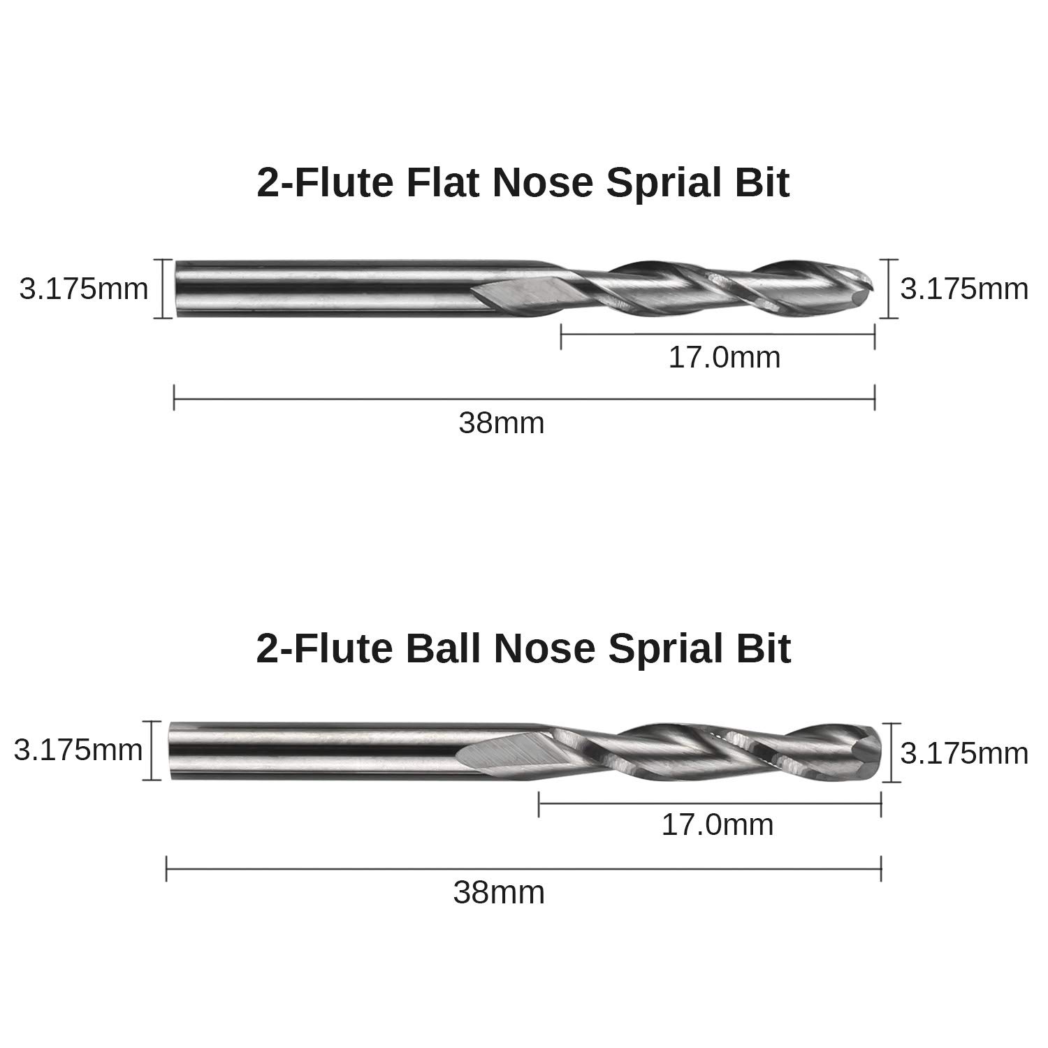 2-Flute Spiral Flat Nose & Ball Nose End Mills -- Shank Diameter: 3.175mm, Cutting Diameter: 3.175mm, Cutting Length: 17mm, Overall Length: 38mm.