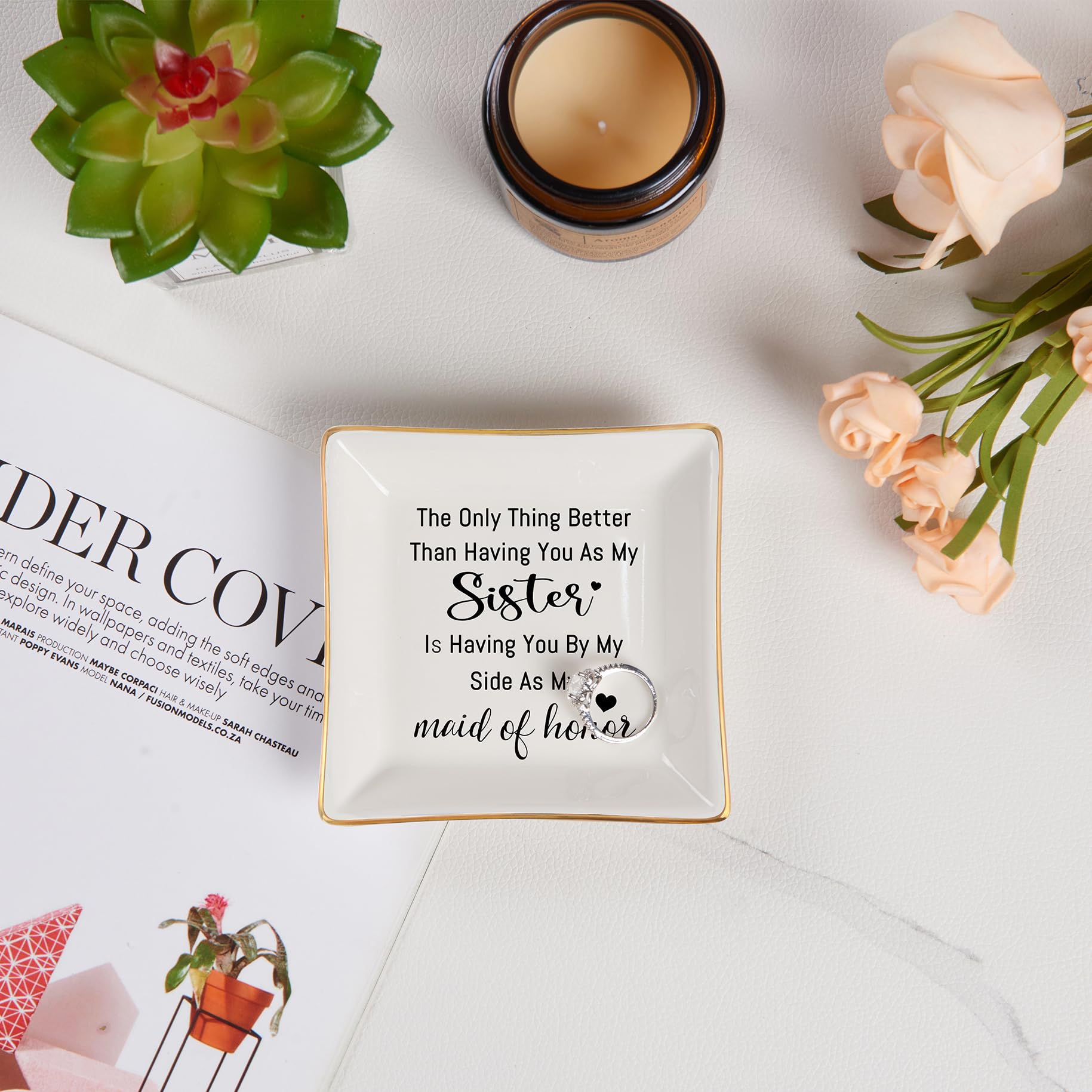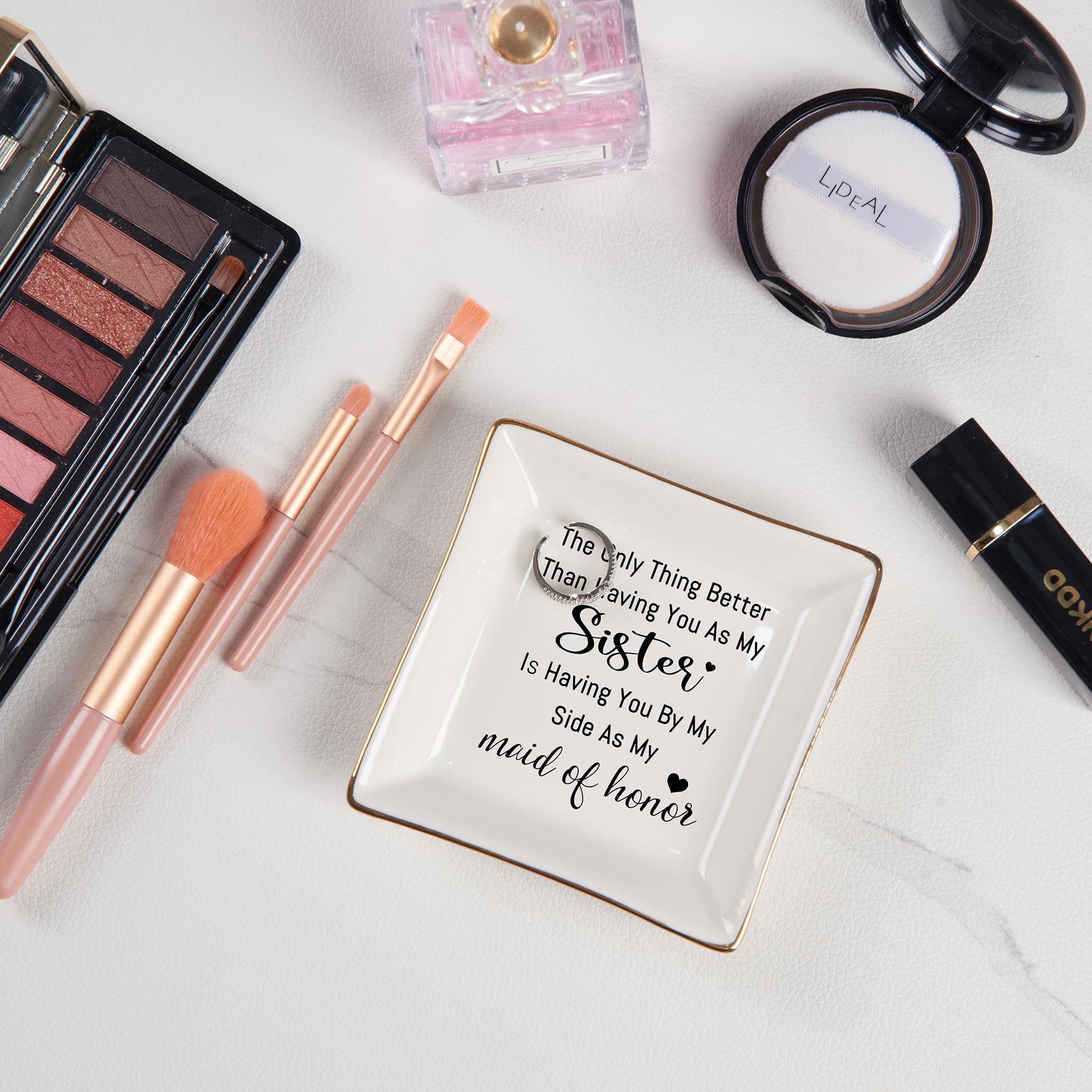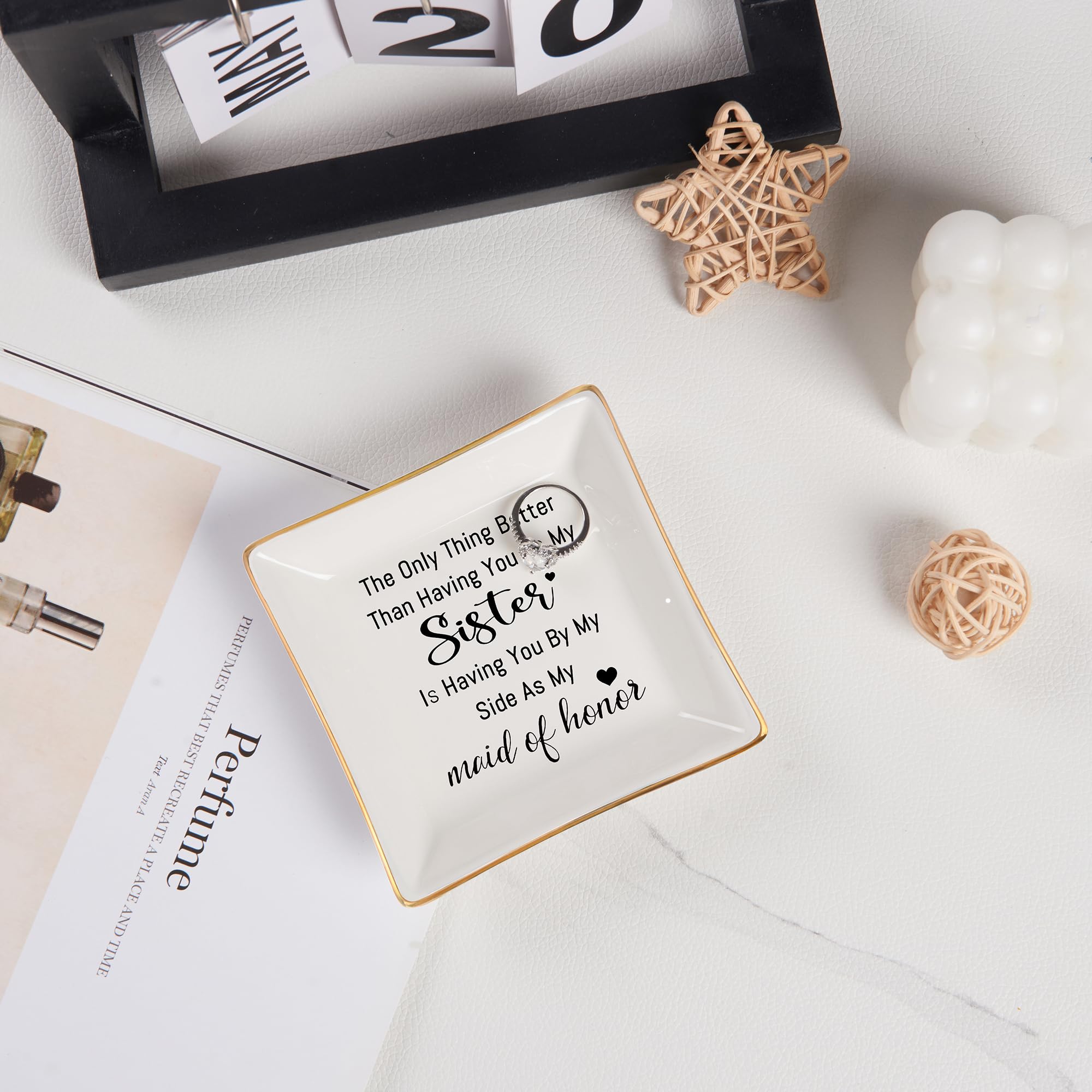 Bridesmaid Gifts: “The only thing better than having you as my sister is having you by my side as my maid of honor." With heartwarming words, the jewelry dish makes the bridesmaid feel love and happy. Ideal for Maid of Honor Proposal Gifts, Matron of Honor Proposal Gifts, Bridesmaids Proposal Gifts, Maid of Honor Gift from the bride, Bridesmaids Gift for wedding, Bridesmaid Thank You Gifts, gifts for bridesmaids on the wedding day, bachelorette gifts for bridesmaids
