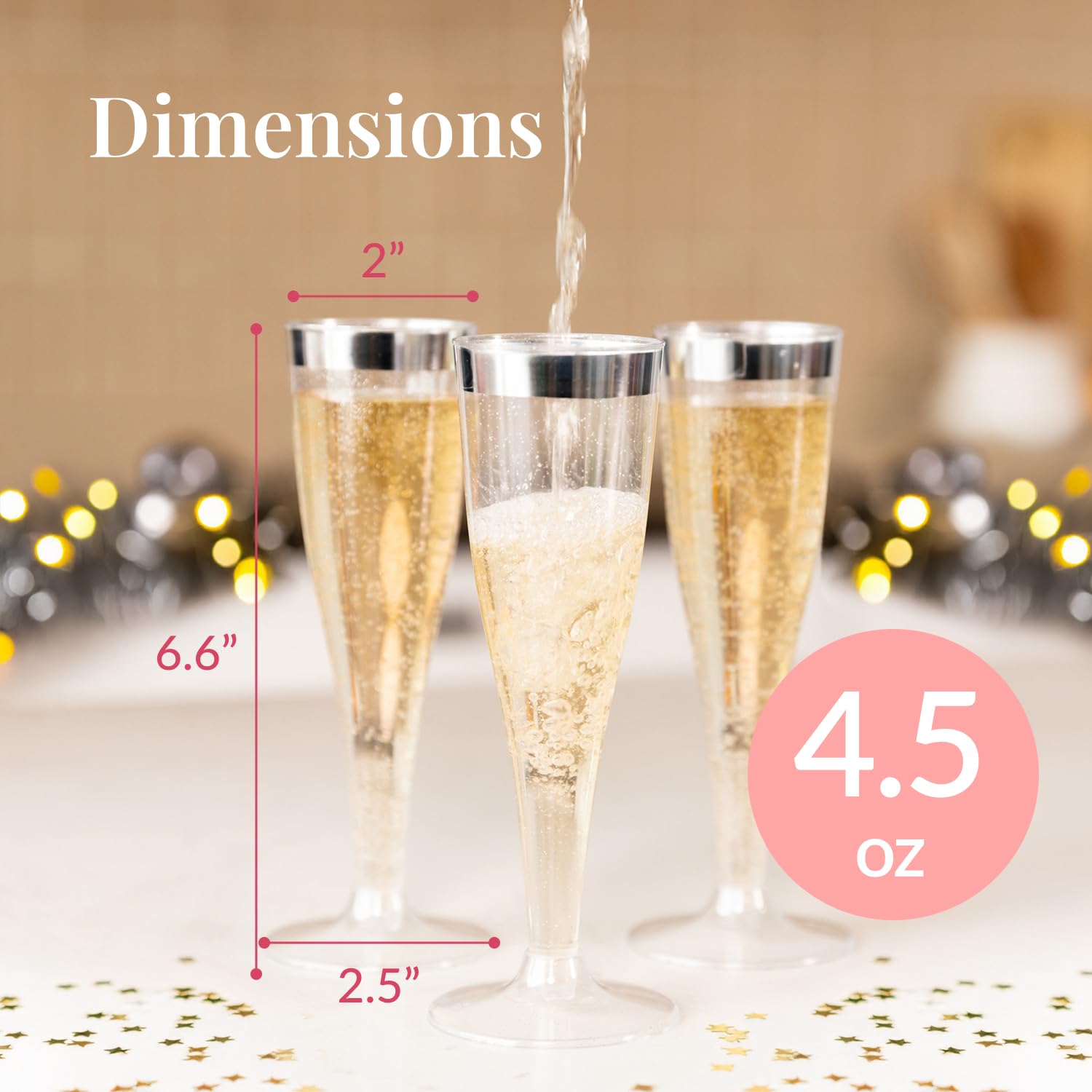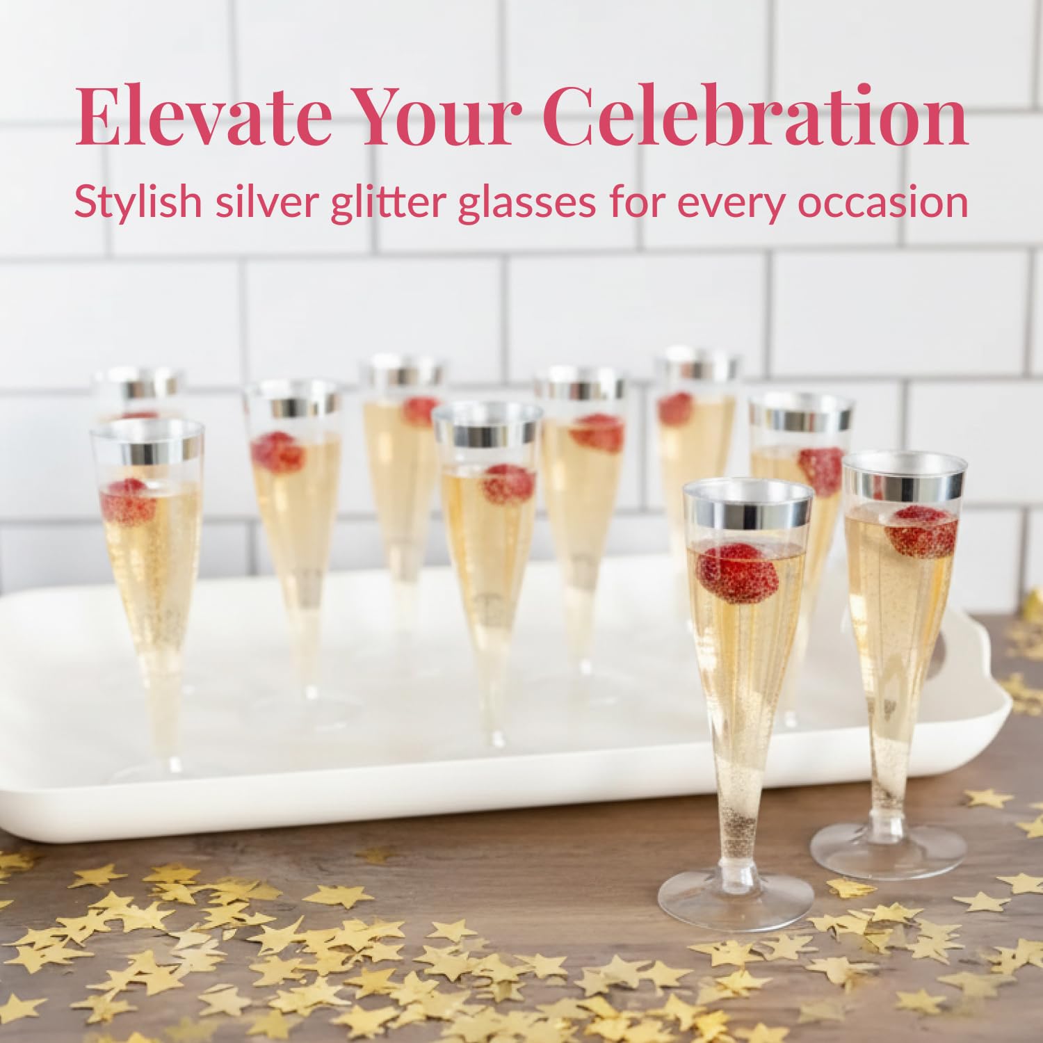 Elevated Look for Every Toast: Impress guests with silver glitter disposable champagne flutes that offer the charm of glassware; perfect for weddings, holidays, and upscale indoor or outdoor events