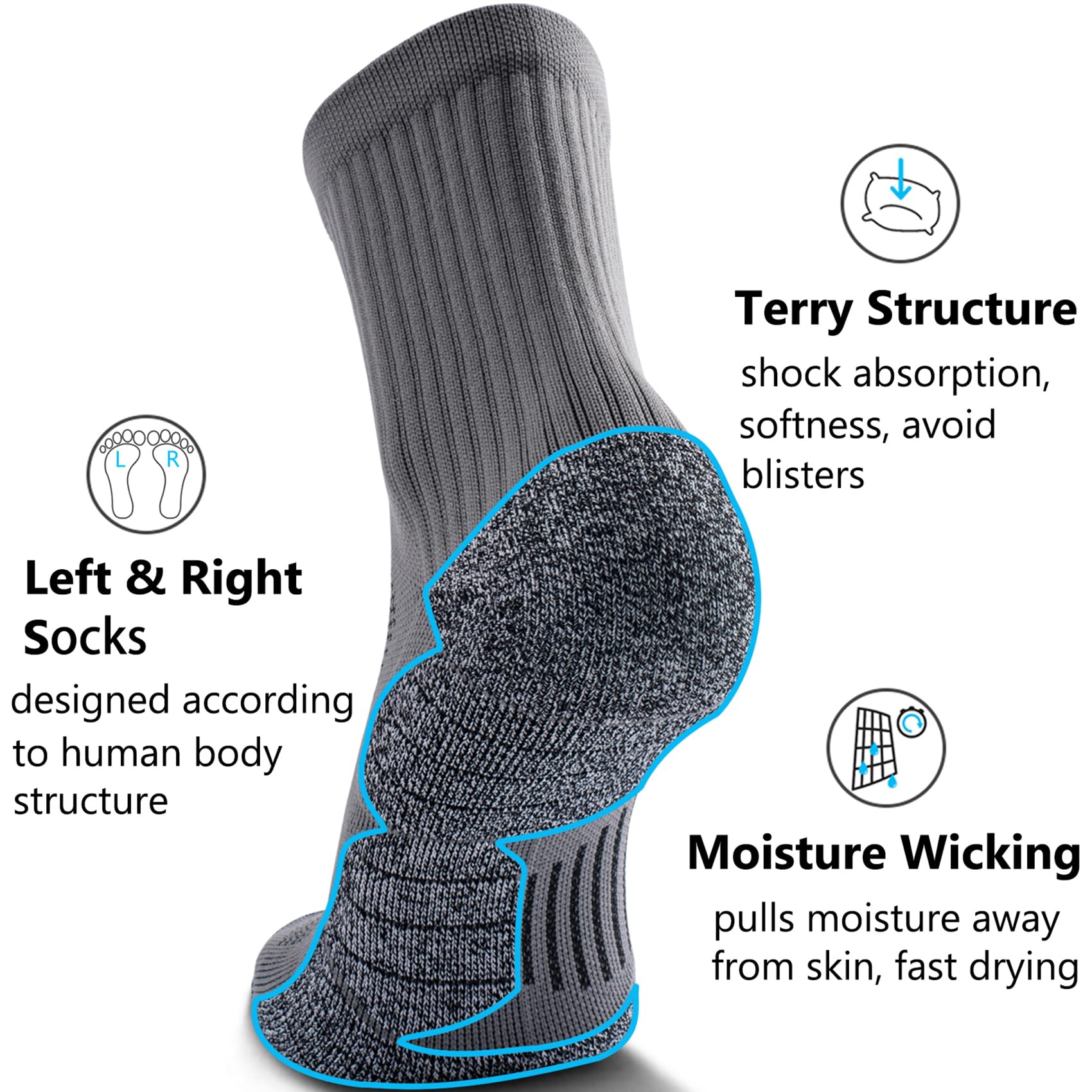 UNIQUE SOLE: Design LEFT AND RIGHT SOCKS according to the plantar structure; Combed Cotton and Tech-dry yarns; Cushioned, more soft and comfy, shock absorption