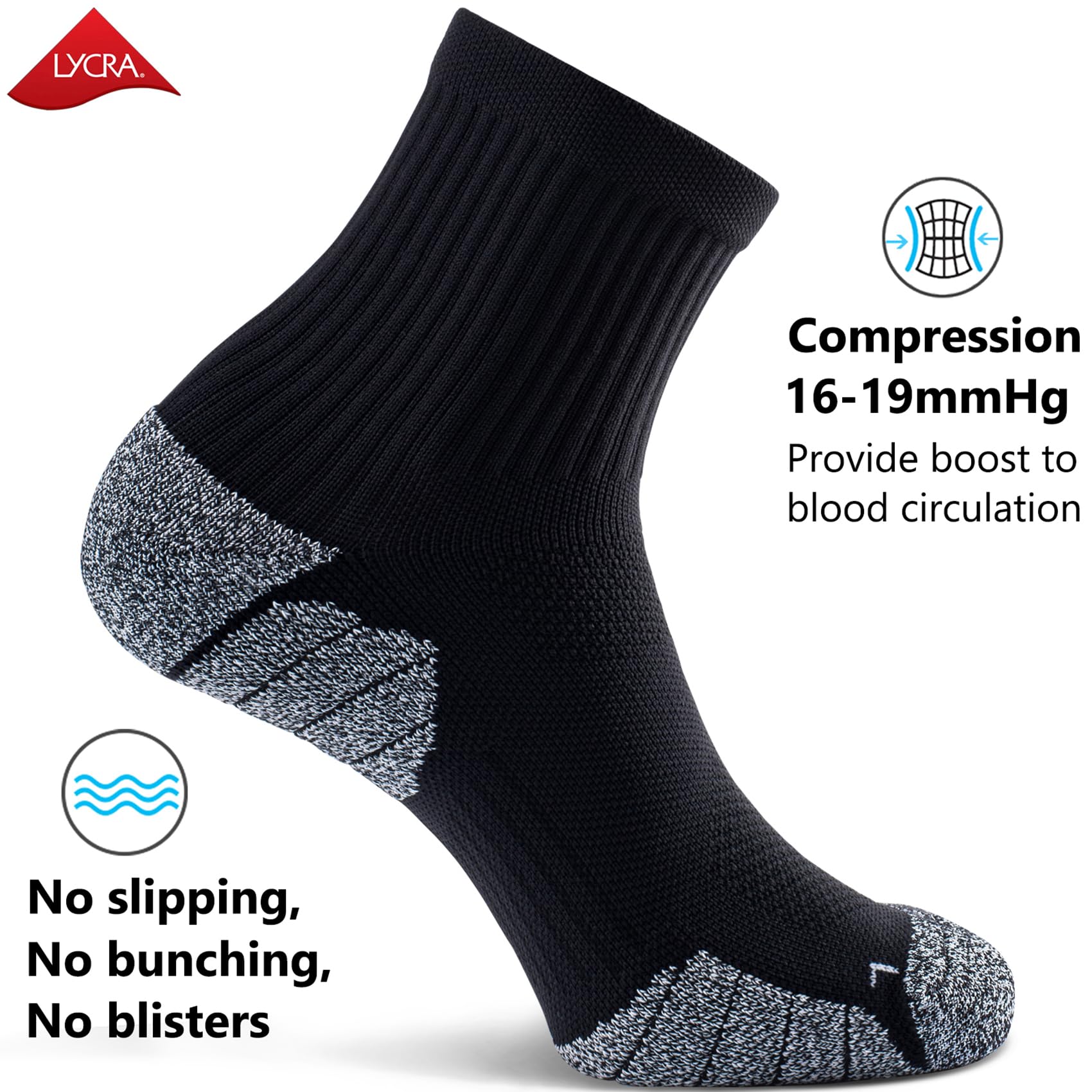 COMPRESSION FIT: Athletic socks with targeted compression (16-19 mmHg) to improve your circulation, anti-swelling, arch support, hug your feet perfectly and no slipping, no bunching, no blisters