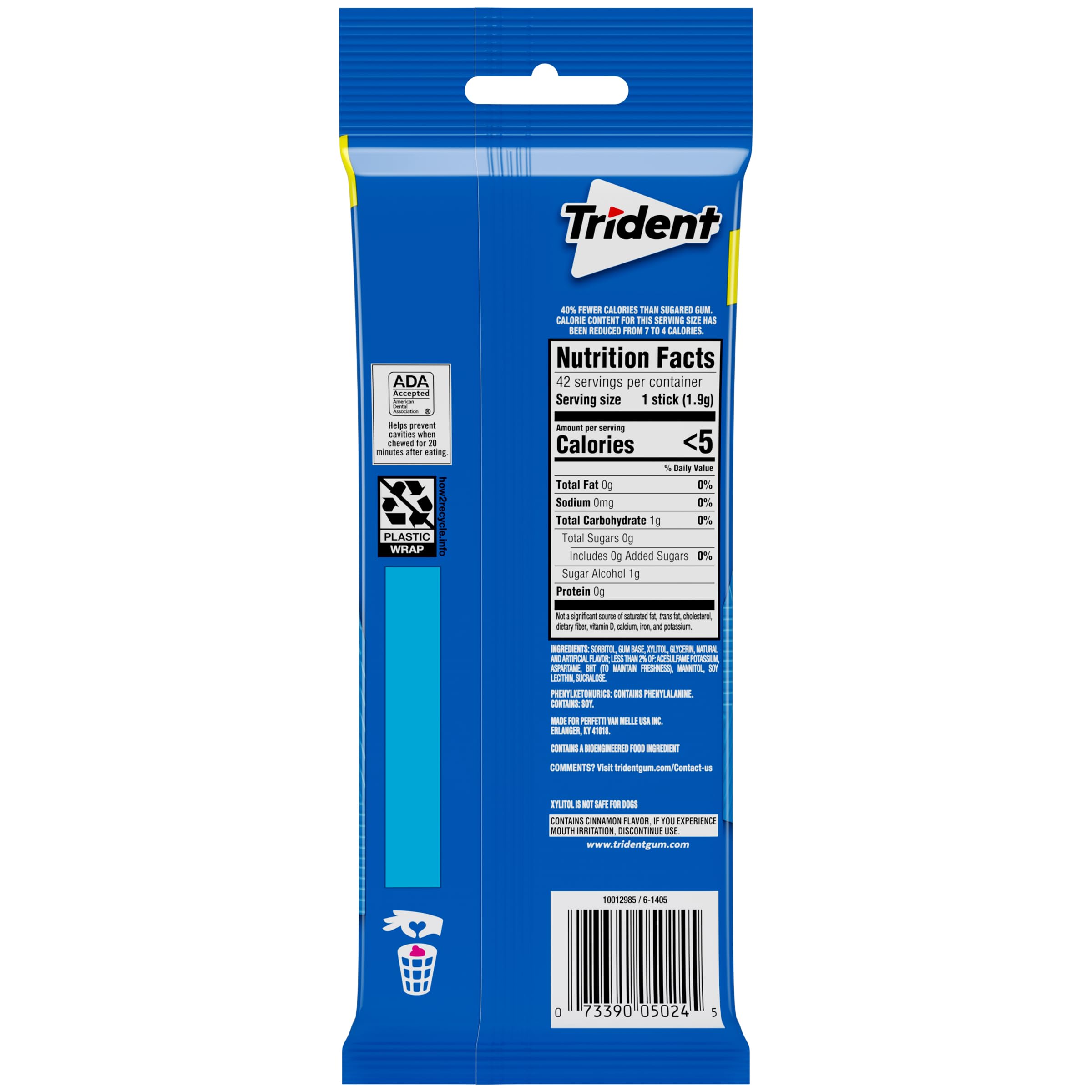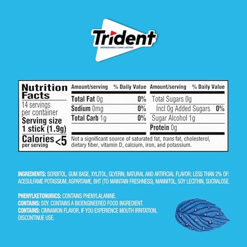 Trident Original Flavor Sugar Free Gum is a delicious way to freshen breath and protect your teeth. With 30% fewer calories than sugared gum, Trident Original gum is sweetened with xylitol, a naturally occurring sugar alcohol. Trident Original combines the flavors of peppermint and cinnamon gum for a unique, refreshing flavor. Trident Original combines the flavors of peppermint and cinnamon gum for a unique, refreshing flavor. The ADA Council on Scientific Affairs found that the physical of chewing Trident sugarless gum for 20 minutes after eating stimulates saliva flow which helps to prevent cavities by reducing plaque acids and strengthening teeth. Bulk gum packs give you plenty to stock your company or small business, and each individual pack is designed so the gum stays inside, making it easy to toss in your car, backpack or desk drawer. These sticks of gum are individually wrapped for freshness.