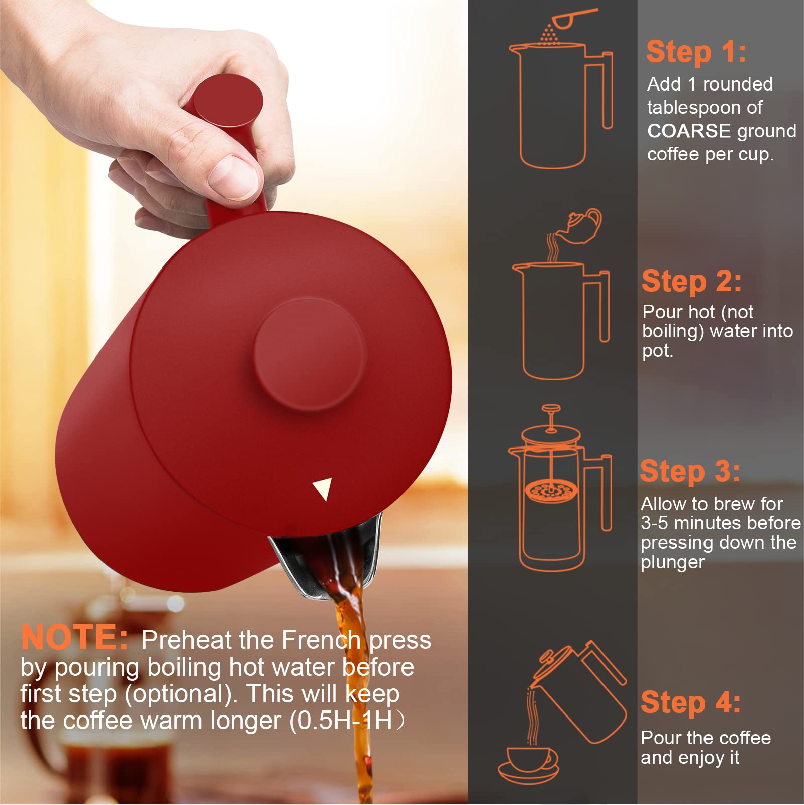 Perfect Brew & Stay Hot:34 OZ Large capacity double-wall stainless steel french press coffee maker will keep your coffee hot for 60 minutes longer than other steel and glass models. Turn the symbol (▲ ) away from the spout for superior thermal retention. Take your time and enjoy delicious coffee