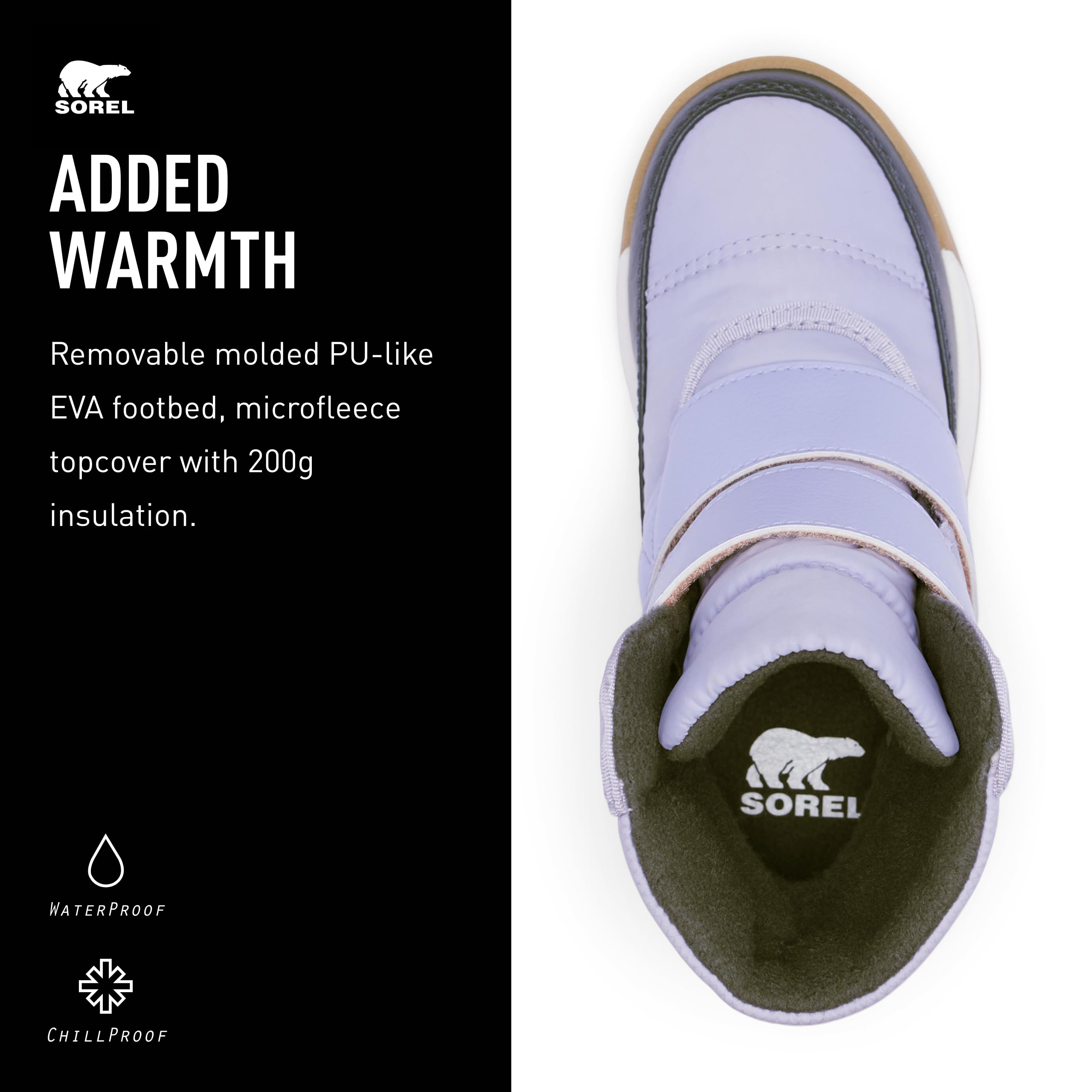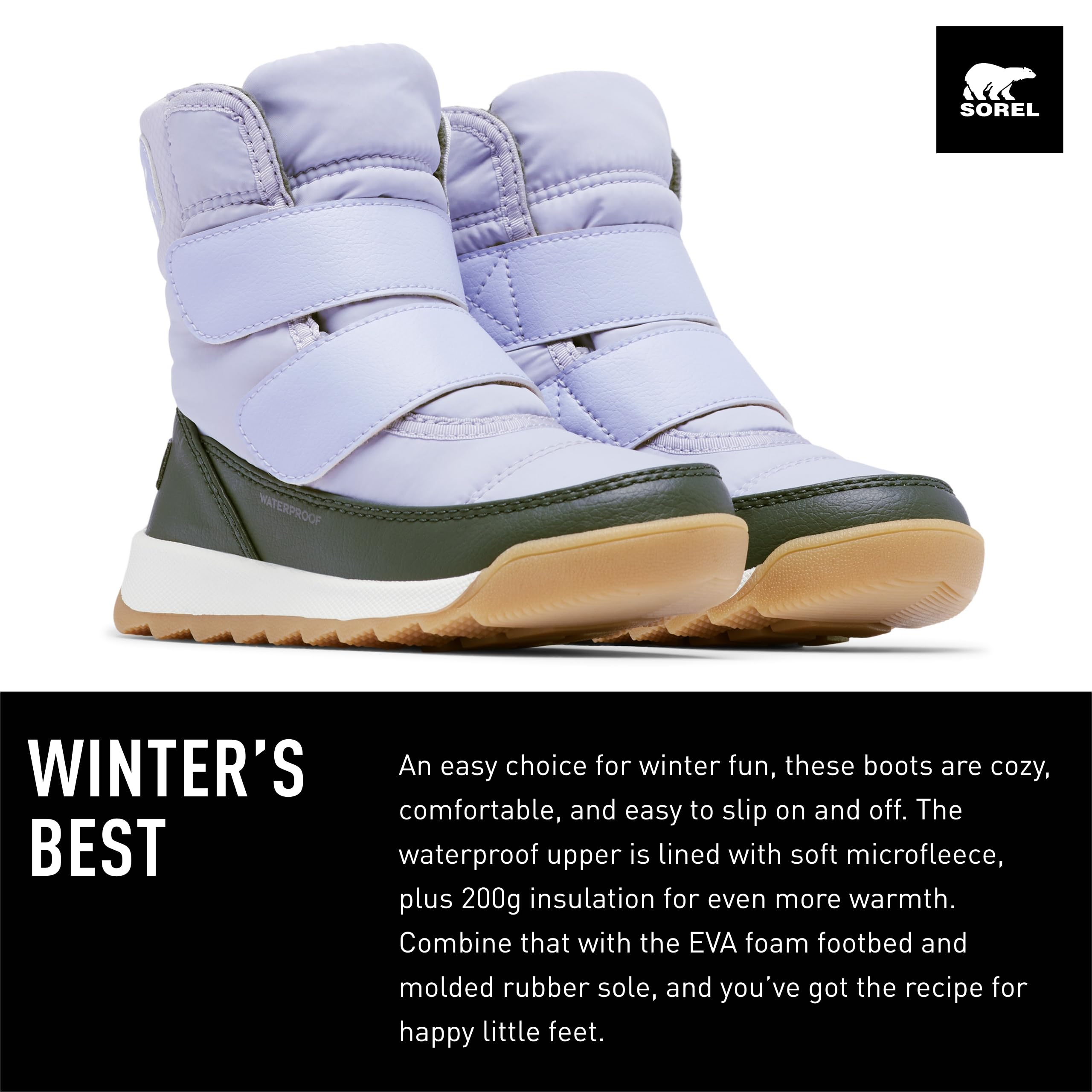 Description An easy choice for winter fun, these boots are cozy, waterproof, and oh-so simple to put on and take off. The durable upper is lined with faux fur and microfleece, plus 200g insulation for even more warmth. Combine that with the EVA footbed and high-traction rubber sole, and you've got the recipe for happy little feet.