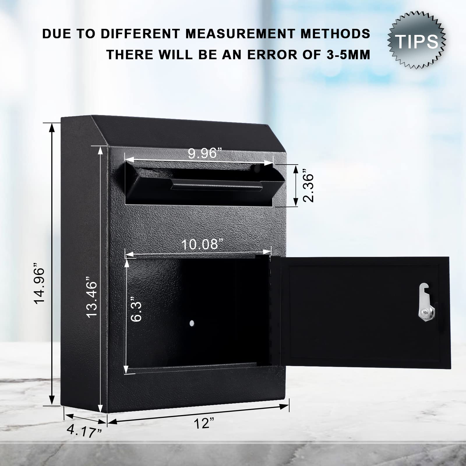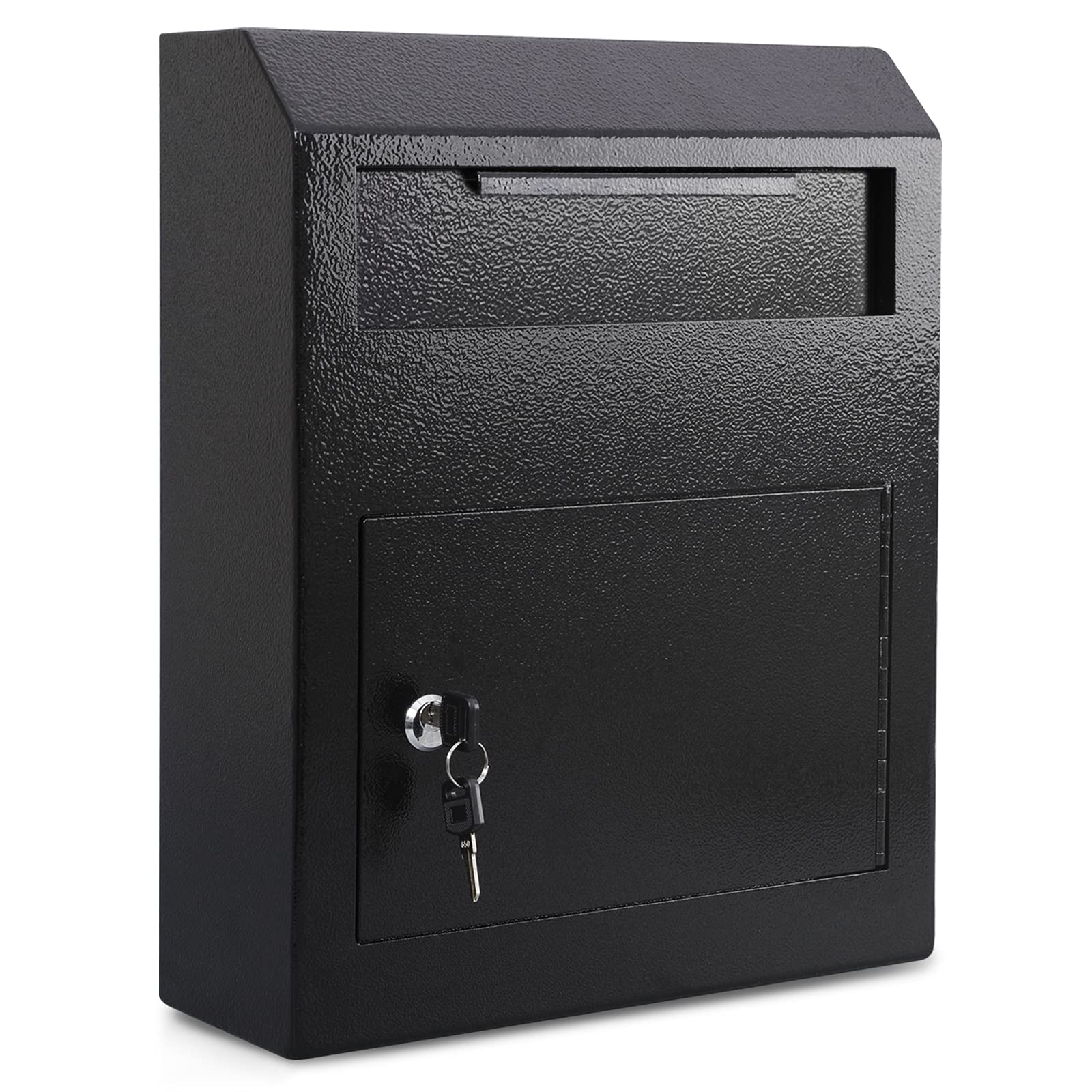 Ample Storage Capacity: Secure drop box wall mount fits hold cash, checks, keys, letters etc., Lockable design provides security for your delivery. Size: 12”X4.17”X13.46”/14.96”