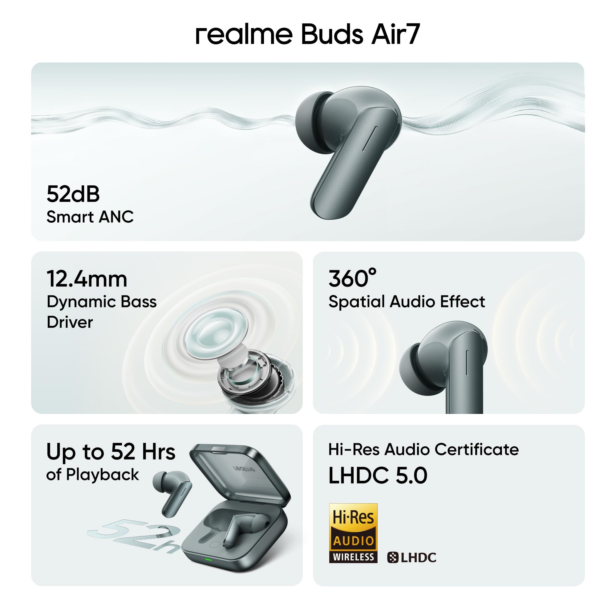 realme Buds Air 7, 12.4mm Dynamic Bass Drivers, 52Hrs Playtime, 52dB Hybrid ANC, 6 Mic ENC, 45ms Low Latency, 360° Spatial Audio, Hi-Res LHDC, IP55 Dust & Water Resistant, BT v5.4