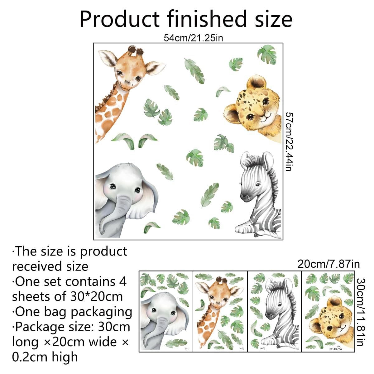 Features: Usages: 1.Clean the surface you want to stick, ensure the surface has no dust, dirt and water. 2.Peel off the stickers from its sheet. 3.Paste the stickers on the surface you want. 4.If the stickers have some bubbles, you can use a ruler or a card to gently scratch the stickers to remove the bubbles. Children's Educational Present : This jungle animal sticker is a great early learning tool, it can stimulate your baby's imagination and cognitive ability. It also allows babies to name various animals and helps them identify colors. This is a great help to improve your baby's early education ability, so that your baby can better understand nature and give full play to their imagination and hands-on ability. Specifications: Material: PVC Color: as shown in the pictures Size: as shown in the pictures Package includes: 4 sheets jungle animal wall sticker Note: Manual measurement, please allow slight errors on size. The color may exist slight difference due to different screen display.