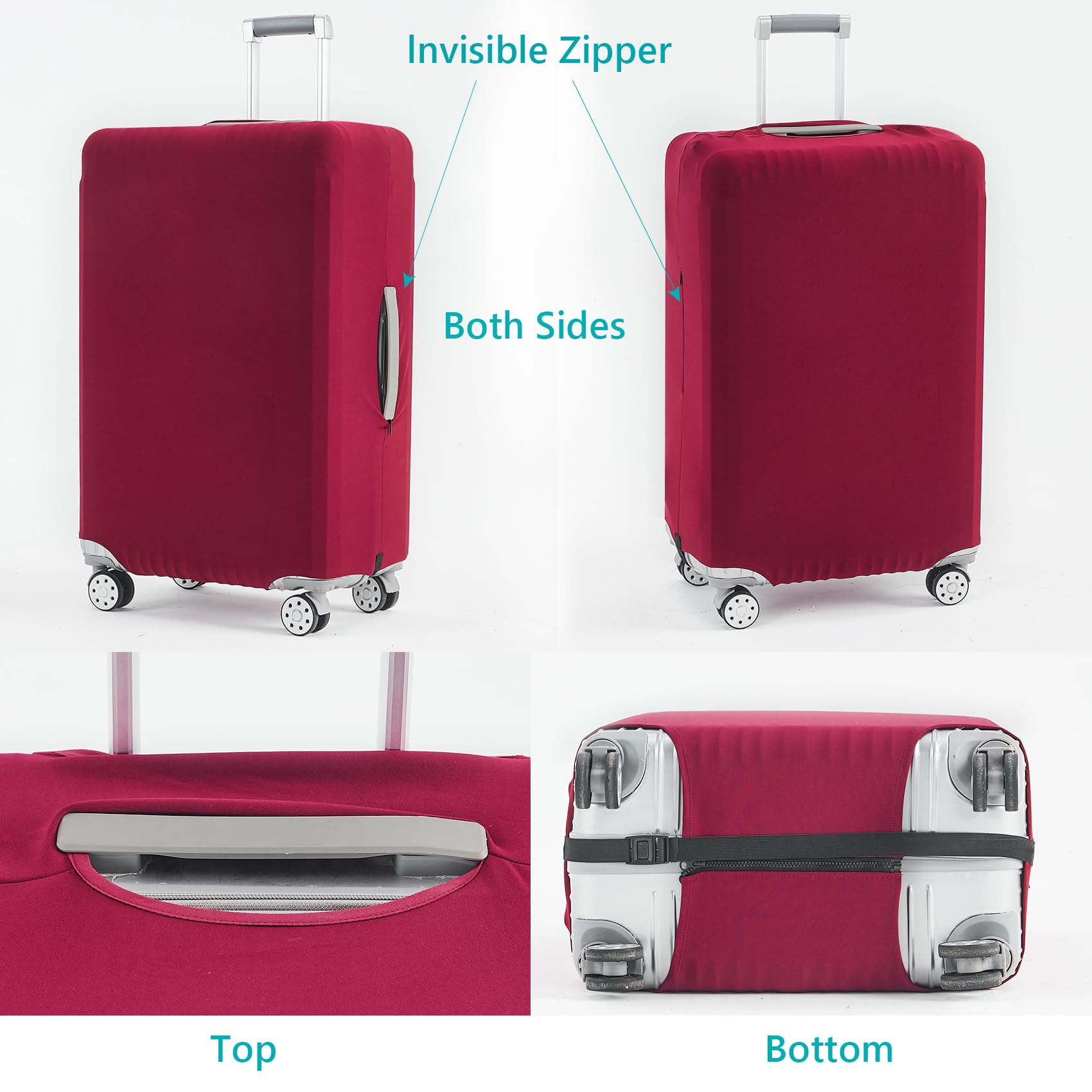 Unique design of luggage covers for suitcase: 2 openings at the top for telescoping handle and carrying handle, both sides have zippers for side handles. The unique design makes you easy to fit and remove