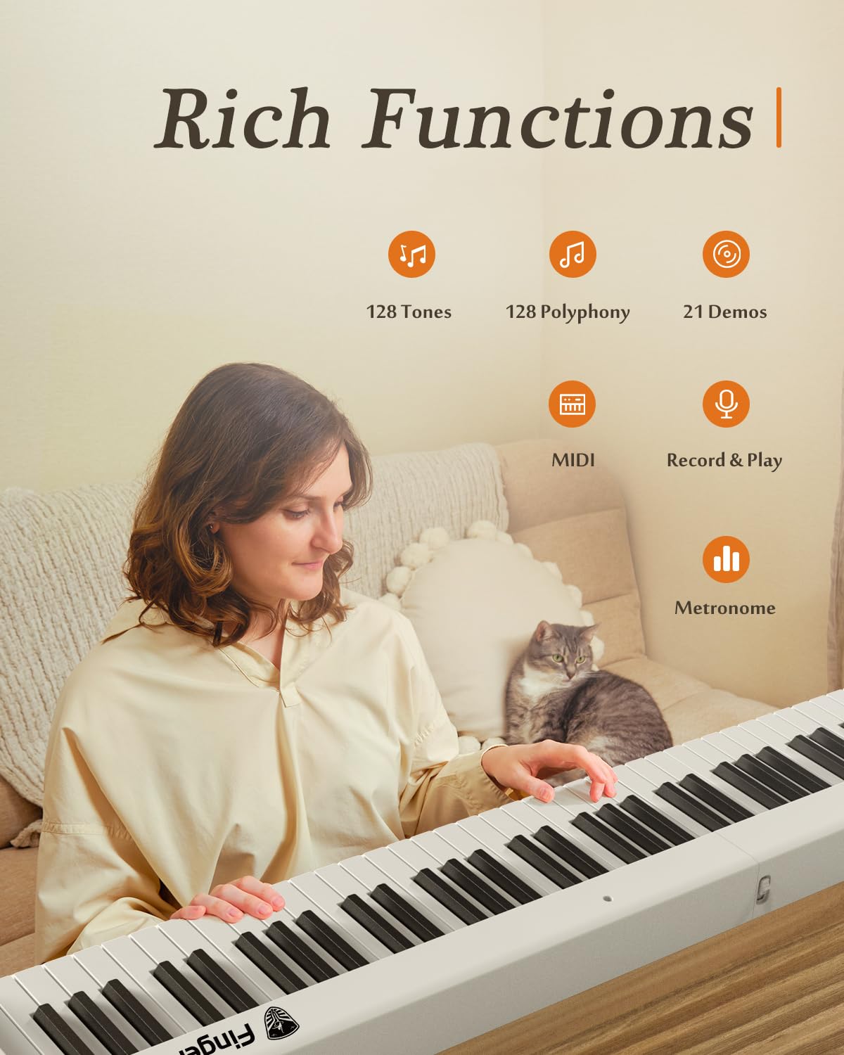 FULL SIZE/SEMI-WEIGHTED/88 KEY - FingerBallet digital piano features with 88 standard-sized keys and provides a realistic playing experience similar to that of a traditional piano. From delicate pianissimos to powerful, the full-size semi-weighted keyboard allows for greater expressiveness and dynamic control