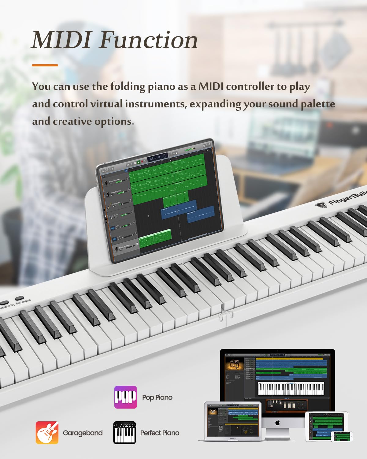 BLUETOOTH/ MIDI CONNECTIONS - Maybe you're looking for a way to get your own tunes recorded without the hassle of mics and wires. That's where Bluetooth MIDI comes in. This effectively turns your FingerBallet piano into a wireless MIDI controller as it interfaces with your mobile device's DAW software apps