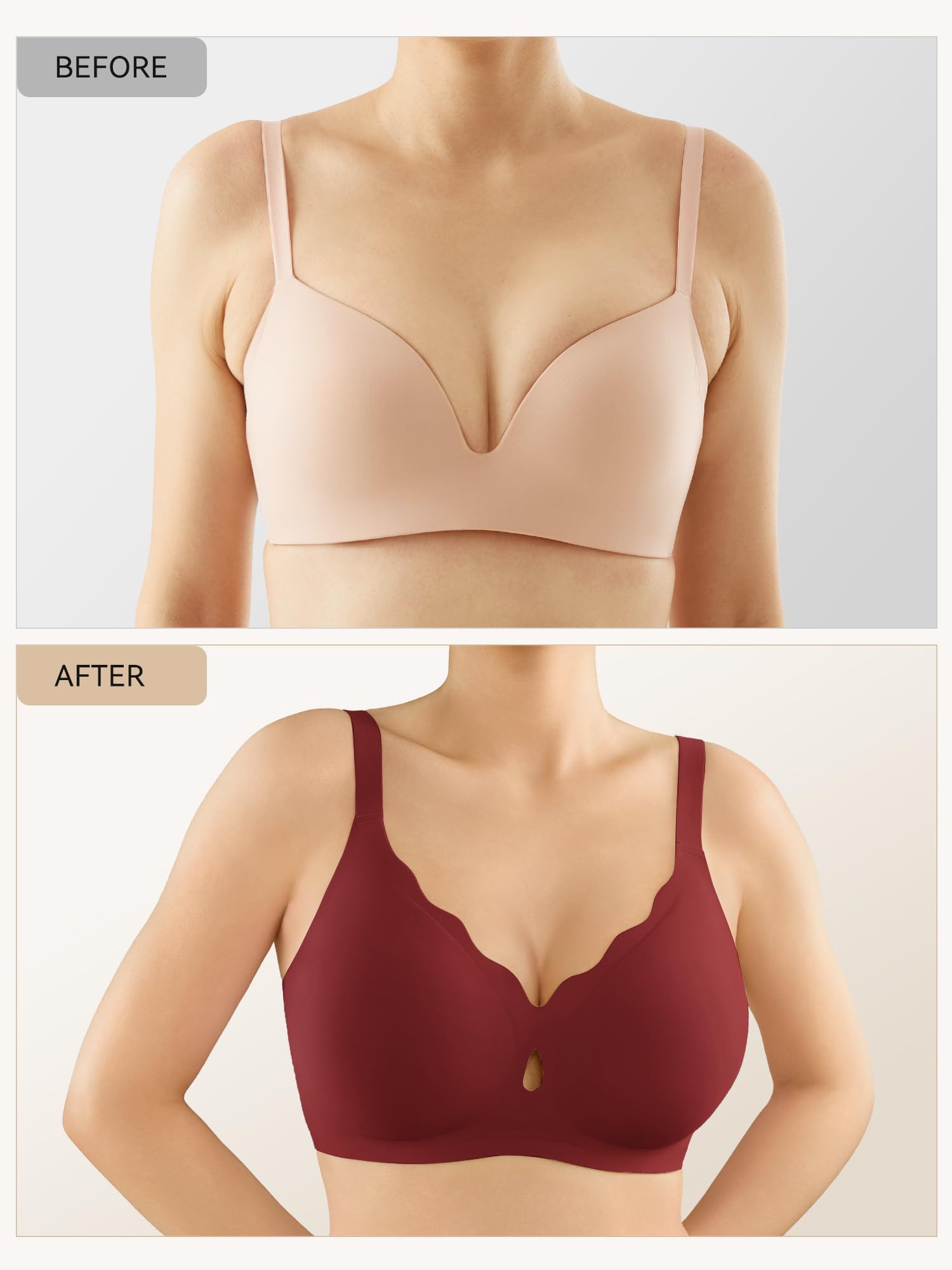 ELEGANT WAVE AND DROP DESIGN: LUCKMEEY seamless bras feature a delicate wavy edge design that enhances natural curves and gives you a smooth, rounded silhouette. The scalloped bra edges contour gently to your bust, creating a flattering shape. The low-cut V-neckline with a water-drop design adds a feminine touch and highlights your bust. This women's everyday t-shirt bra for women is lightweight, invisible, and non-see-through, giving you a smooth look under your clothes.