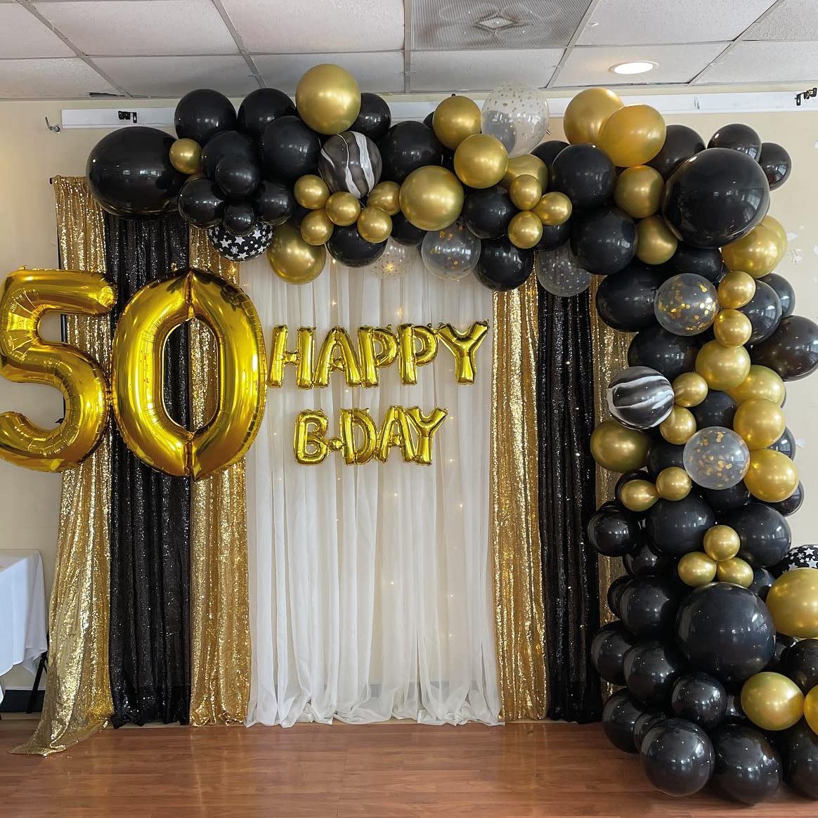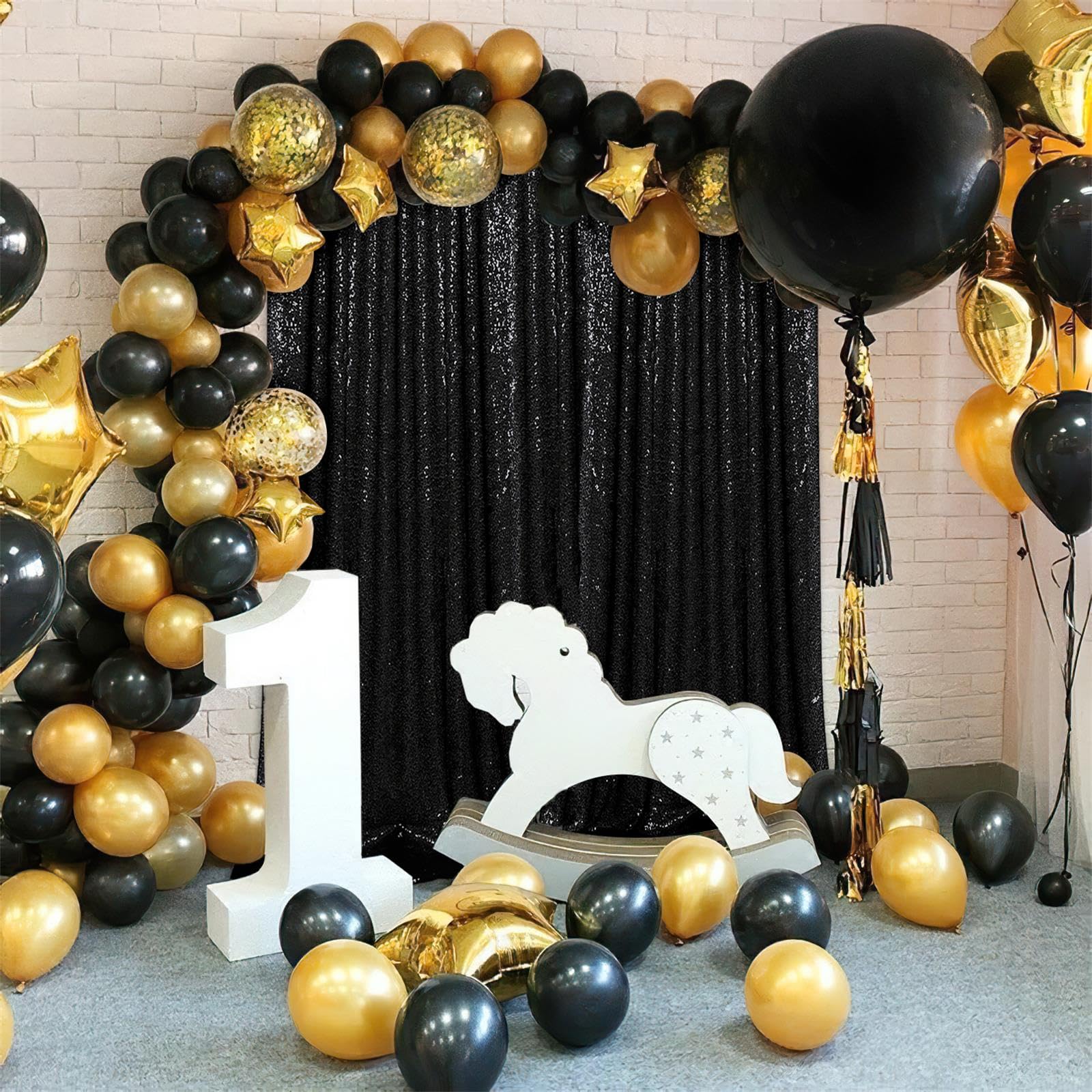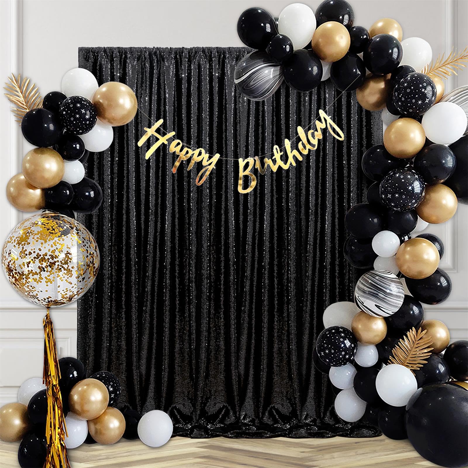 Black Backdrop Curtains:The shimmer backdrop curtain is made of thick fabric without any wrinkles ,and paired with dazzling golden sequins. Hang them on window or wall as a backdrop,or it could be one entrance to the party. And you can paired with balloons, banners and various photo props on this backdrop,create a unique and exquisite themed party.