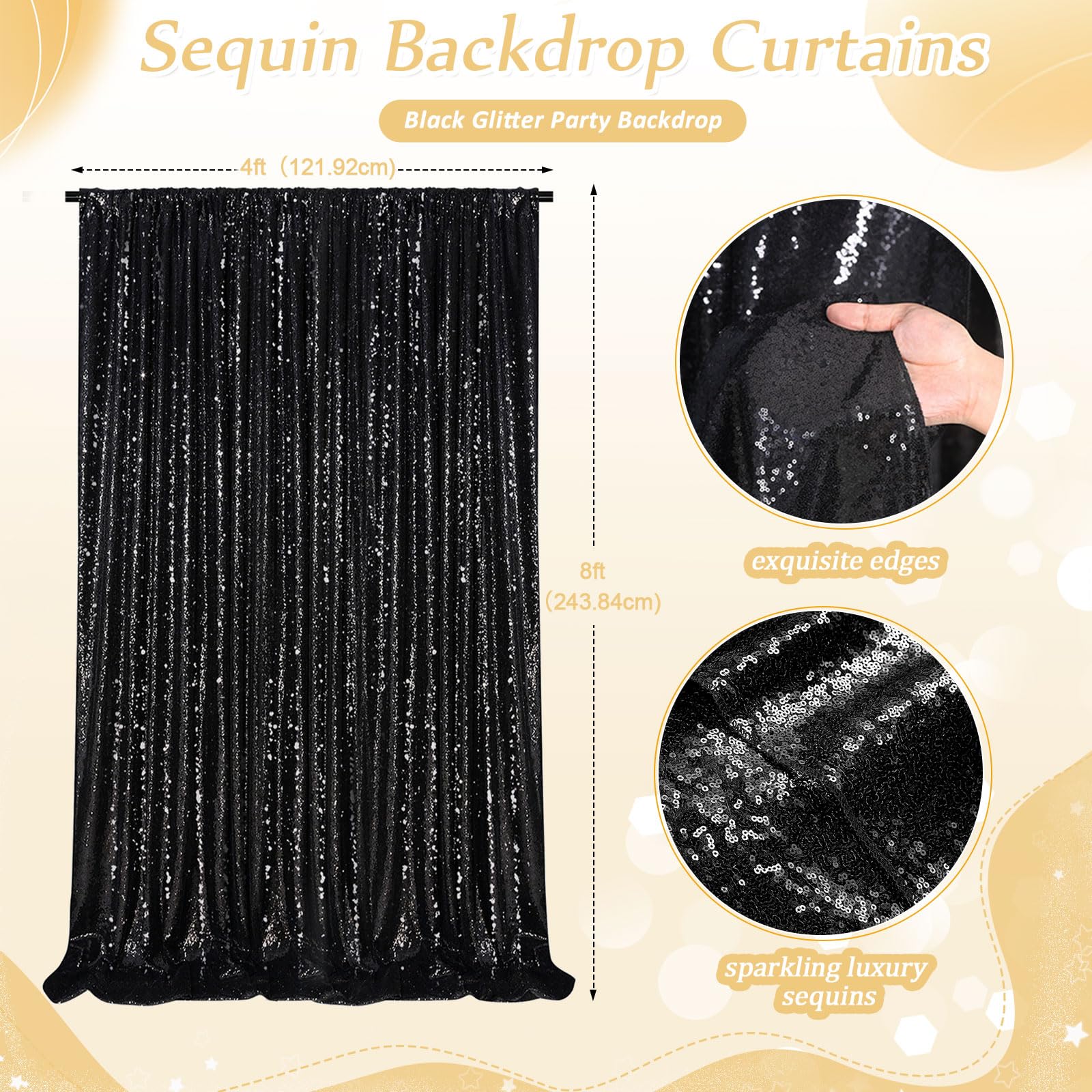Sequin Backdrop Curtains: Package contains 2Pcs 4ft width by 8ft height backdrop curtains. With a 4-inch rod pocket on the top for easy to be hung on most backdrop stands or curtain rods, and all sides over locked with folded and hemmed edges to ensure the stability during hanging.