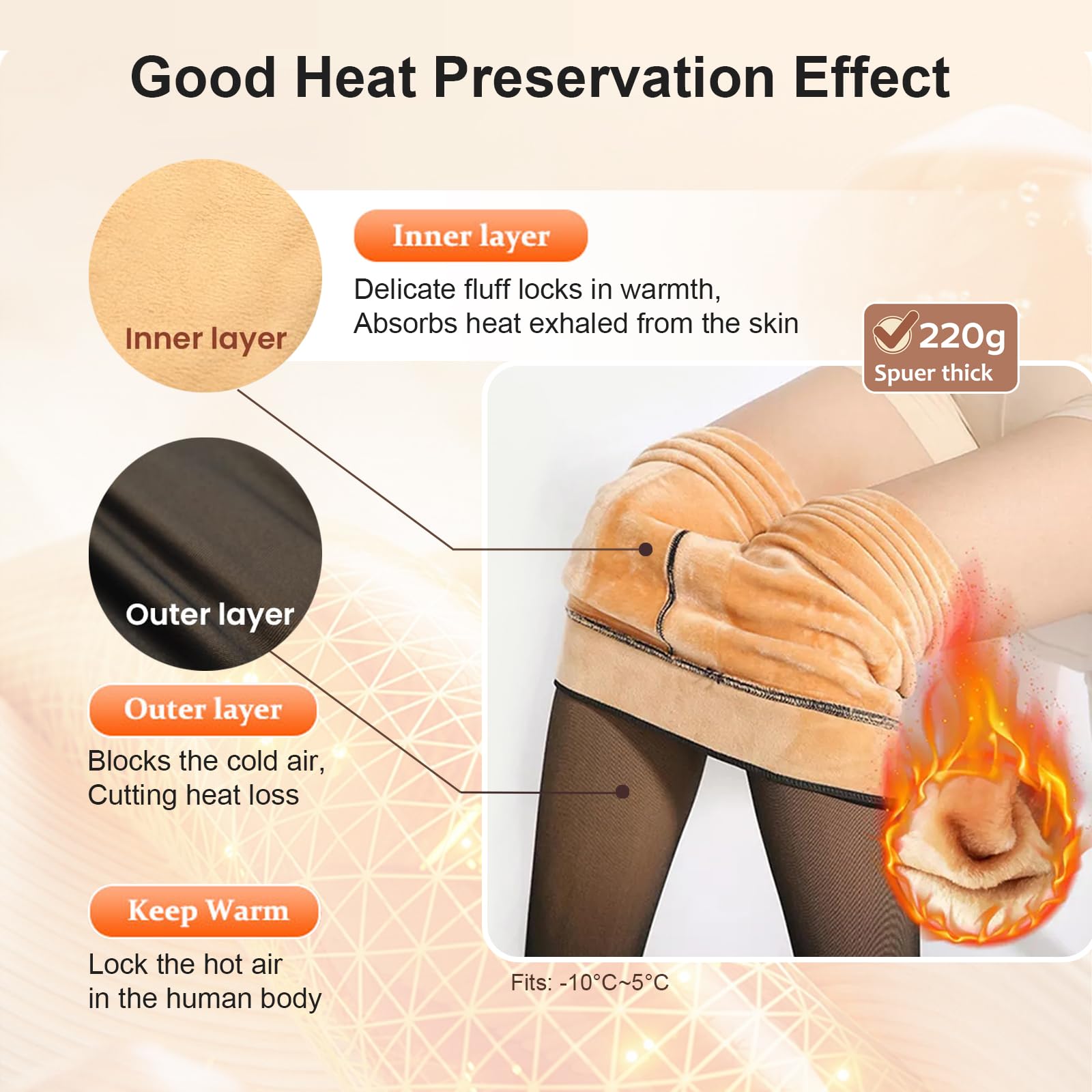 Plush Fleece Interior, More Warmth: The Plush Thickened tights are made of soft, stretchy material which is smooth, warm and not easy to pilling. 220g thick fleece lining traps body heat while slimming your figure, keeping you warm in winter without being bulky. The thermal leggings Include 73% Polyester, 20% Spandex, and 7% Nylon&fleece.