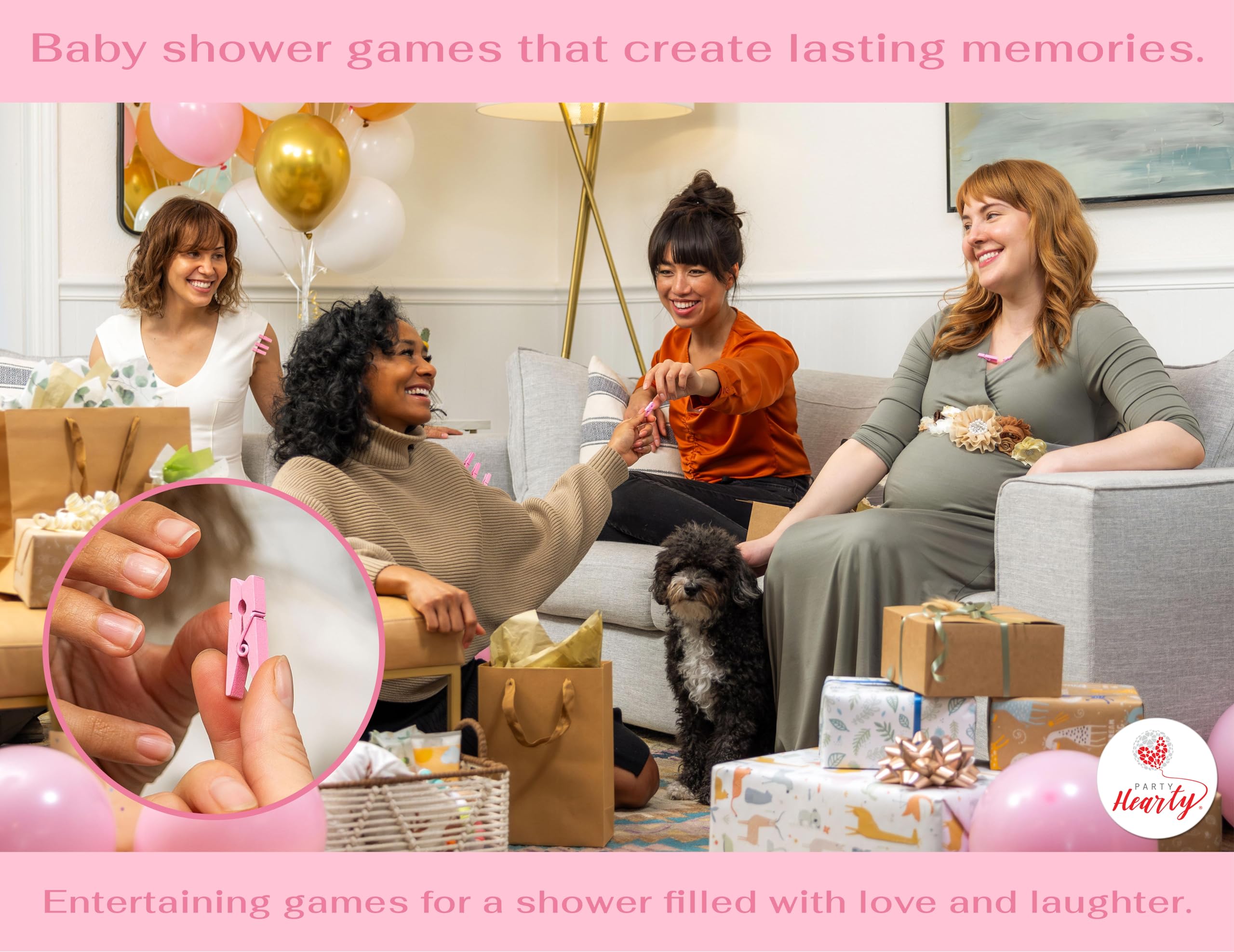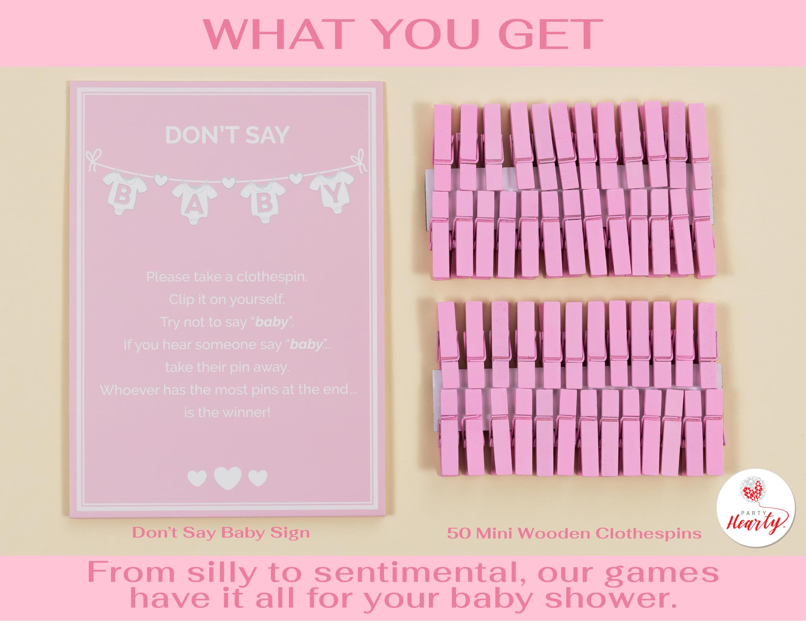 BABY SHOWER GAME EXTRAVAGANZA Includes: 1 Pink Donβt Say Baby Sign (5x7 inches) professionally printed on premium paper and 50 Pink Wooden clothespins (1.4x0.3 inches) plenty for all your guests