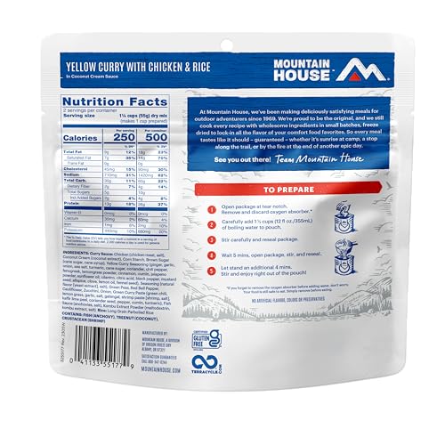 Meet Mountain House Yellow Curry with Chicken & Rice. Made with no artificial flavors, colors, or preservatives and certified gluten-free by GFCO, this meal takes freeze-dried camping food to new heights. It's so incredibly delicious, that your friends will think you brought your favorite takeout on the trail. Enjoy tender pieces of chicken, zucchini, peas, and red peppers mixed with our signature curry sauce with just enough spice to liven up the palate and warm the soul without being a challenge to casual curry fans. And the best part? Preparing Mountain House Yellow Curry is easy. With Mountain House, say goodbye to extra pots and pans and the hassle of lengthy preparation - simply add hot water to the pouch, and in just 10 minutes, your taste buds will be dancing with excitement. Mountain House meals are lightweight and portable, lightening your load when every ounce in your backpack matters. That's what makes our meals ideal for camping, backpacking, or wherever your adventure takes you. Plus, our pouches can be recycled for free through TerraCycle, helping to keep our trails pristine for future adventurers. With the industry's longest proven shelf life and backed by our steadfast 30-Year Taste Guarantee, Mountain House isn't just your go-to for camping food, it's also an essential addition to your emergency food supply, ensuring you're always prepared for whatever curveballs Mother Nature throws your way. Since 1969, Mountain House has been serving up mouthwatering meals for outdoor enthusiasts. As the original trailblazer, we still cook every recipe with wholesome ingredients in small batches, freeze-dried to lock in all the flavors of your favorite comfort foods. Whether it's breakfast at camp, a mid-hike stop along the trail, or a fireside feast after a day of adventure, every ounce tastes just right - guaranteed. Adventure awaits, savor it with Mountain House! Packaging may differ, but don’t worry, it’s still the same great stuff inside!