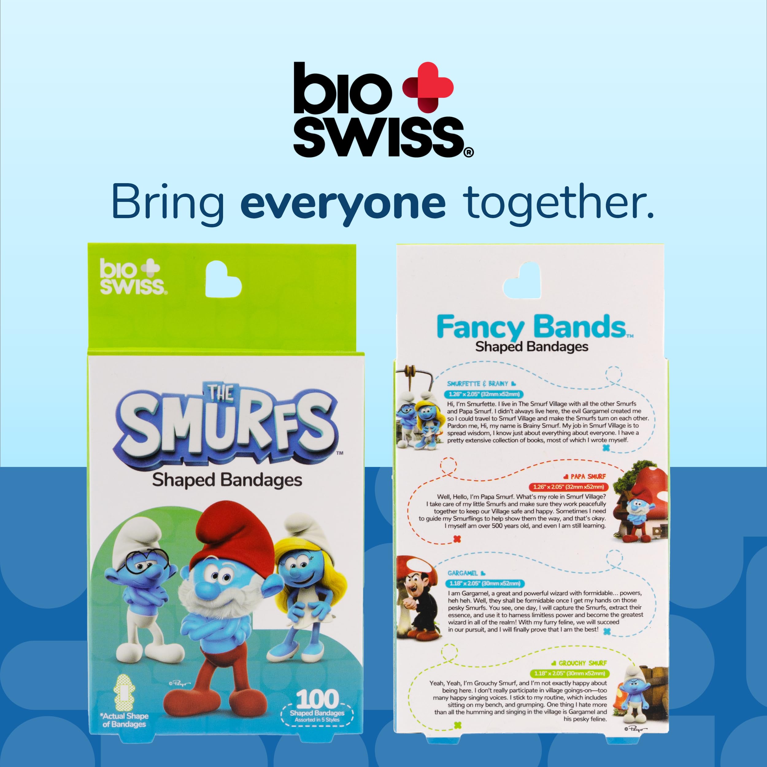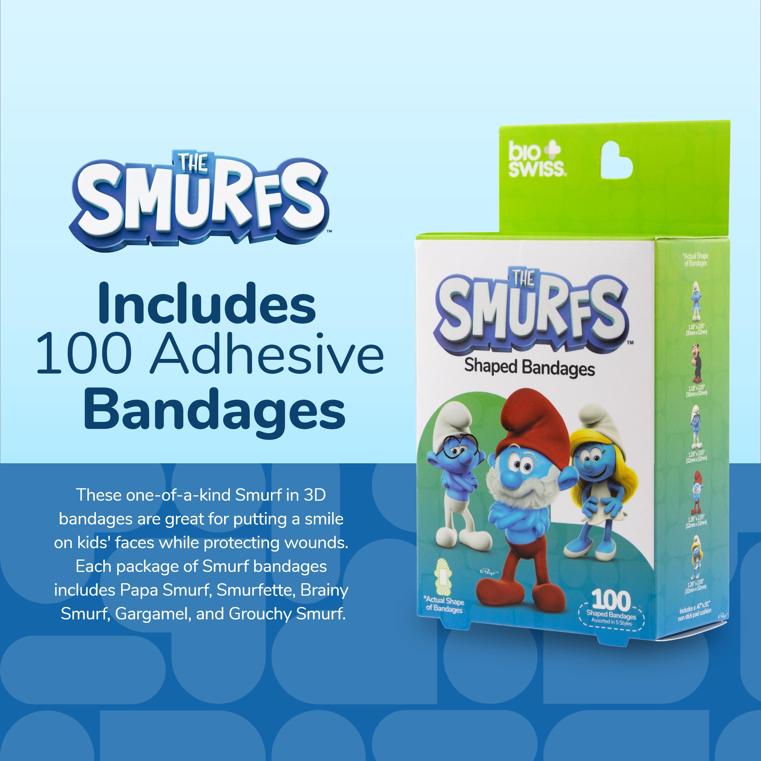 They say laughter is the best medicine, and these fun Smurf novelty bandages are a great way to put big smiles on the faces of both little boys, girls, and even adults while treating their boo boos. These skin bandages aid in the treatment of a variety of different wounds, whether it be for a minor cut, burn, scrape, shot injection, blister, and much more. These small size flex bandages feature absorbent, non stick cushion pads which aids in protecting the injury without sticking to the spot of the wound, wrapping comfortably on your arm, leg, face, knee, or even to wrap around your finger tip, and much more. This self adhering bandage box contains 100 bandage strips shaped as all your beloved The Smurfs in 3D characters: Papa Smurf, Smurfette, Brainy Smurf, Gargamel, and Grouchy Smurf. These bandages are individually wrapped for safe handling, making these childrens bandages great for travel, home first aid kits, school nurses, and pediatric medical practitioners. Our cute and funny junior bandages are composed of sterile, latex free, breathable, and flexible material for reliable long-lasting quality. These boy and girl fun shaped bandages are perfect for schools and playgrounds, and also make for cute stocking stuffers, fun Easter basket present, or even as a funny white elephant gift. Our bandaging supplies pack is an excellent way to put your child, toddler, or baby at ease, even with a booboo.
