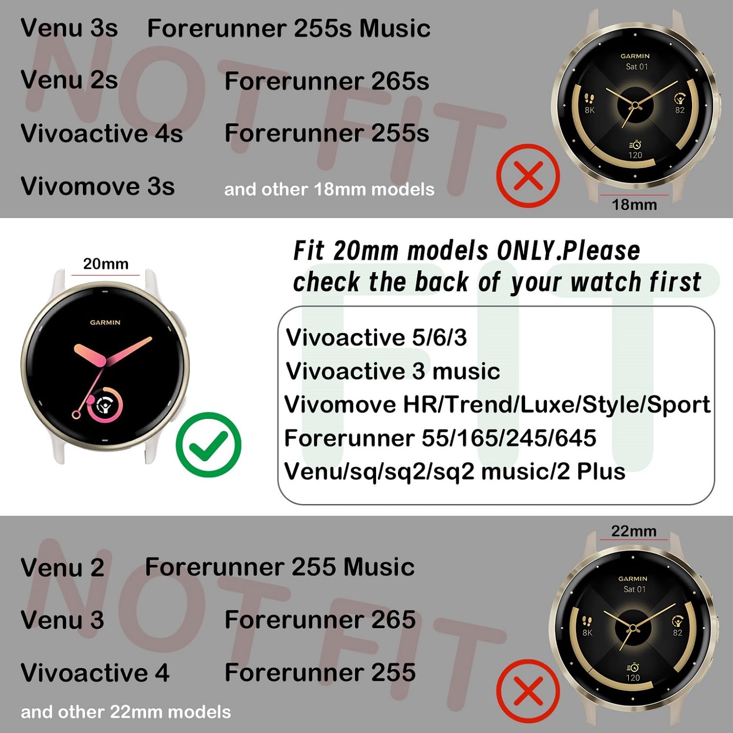 【Wildly Compatible】Specially Designed fabric bands compatible with Garmin Venu/Venu Sq/ Sq 2/Vivoactive 5/Vivoactive 6/Vivoactive 3 Music/3/Venu 2 Plus(NOT Venu 2/2s)/Vivomove trend/HR/Luxe /Style/Garmin Forerunner 165/645/245/55 Music/570 42mm,Approach S50/S44/S42/S40/S12.also compatible with any watches with 20mm lugs.Please check your watch model before buying