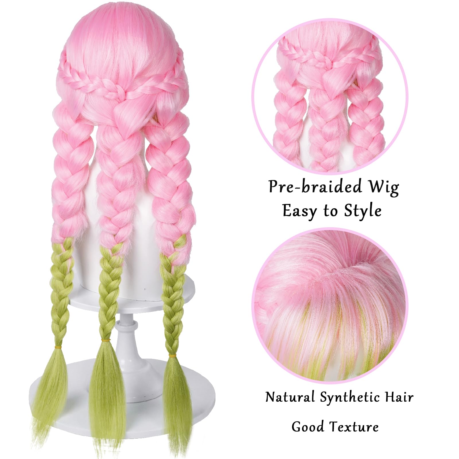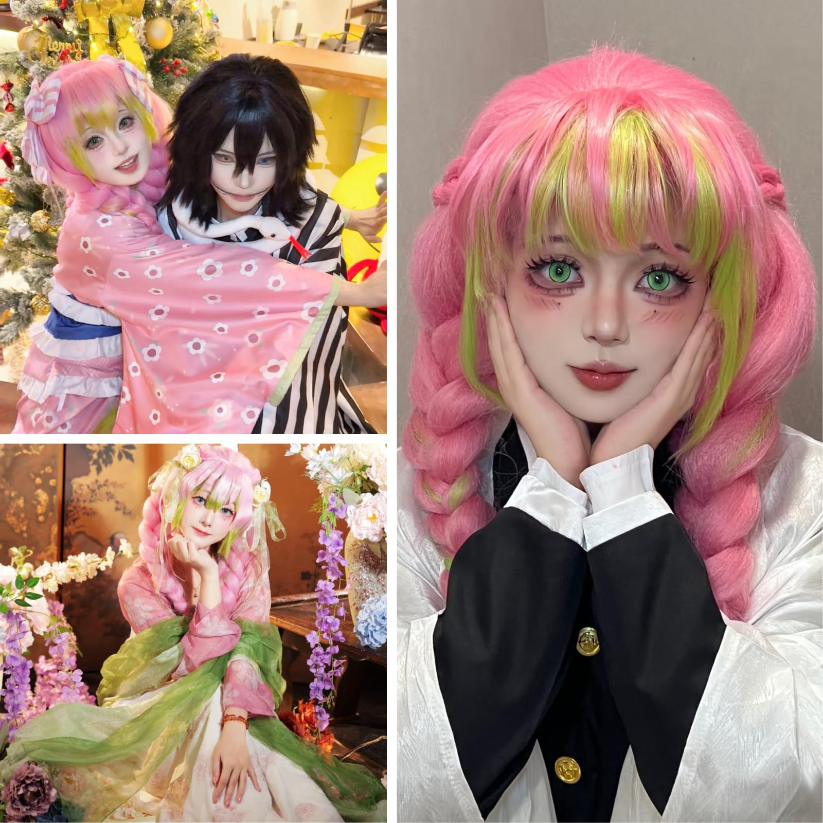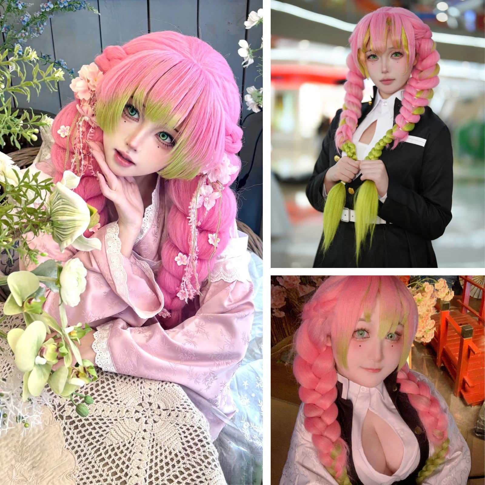 CHARACTERS: Wigs for Kanroji Mitsuri cosplay costume and characters in pink green braided hair wig. Package included a pink green mitsuri wig + a cap(to hold your hair in place before putting on the wig)