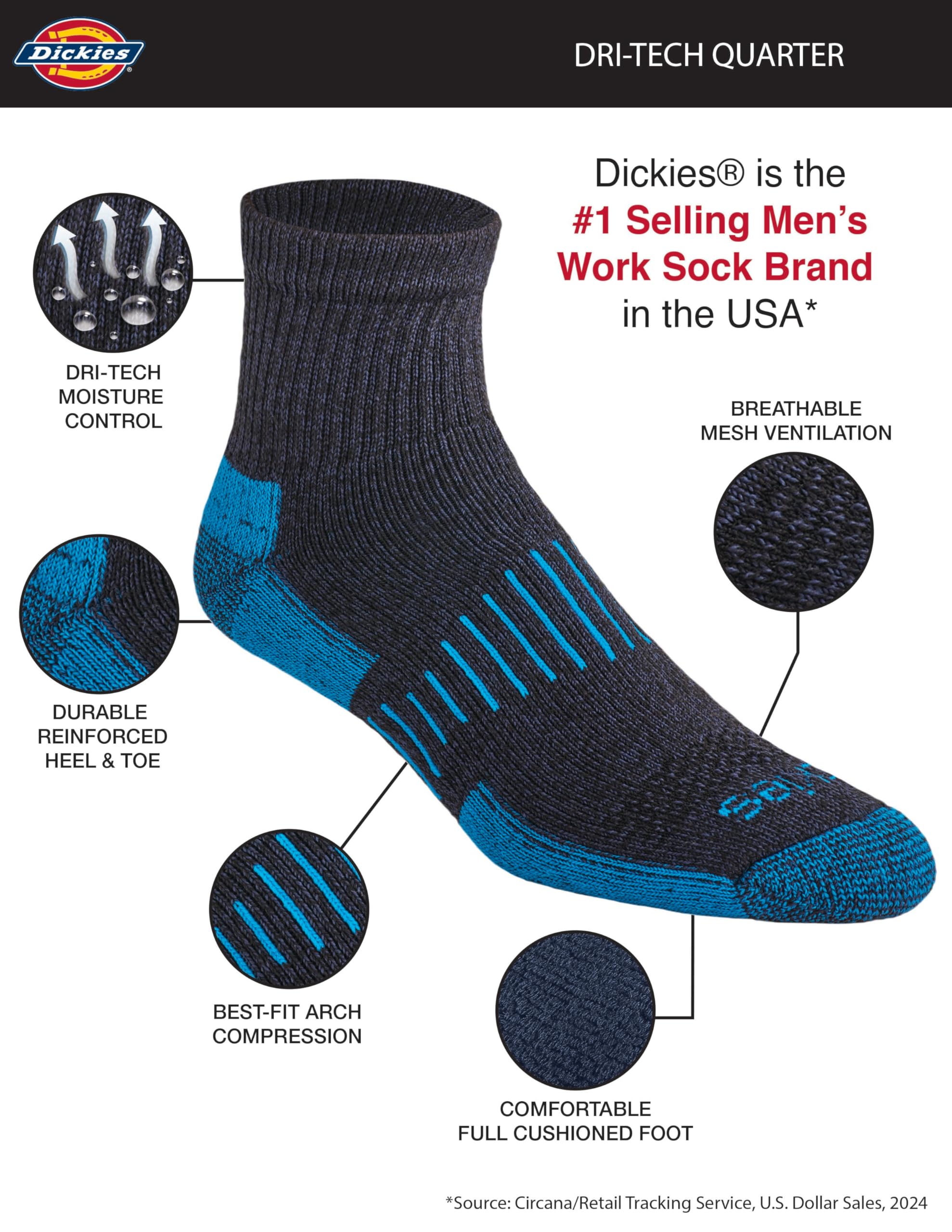 Description Dickies Men's Dri-tech Moisture Control Quarter Socks Multipack with wicking, moisture management fibers keeps feet dry, ventilation channels engineered for air circulation and moisture control, arch compression hugs feet and keeps socks in place, while providing in-step support, Reciprocated heel and toe for superior fit and full cushion comfort. For Over 95 Years Dickies has been making hard-duty work products built to stand up to whatever life throws at you. Dickies Work Socks are built with purpose to deliver superior comfort and performance on and off the job.