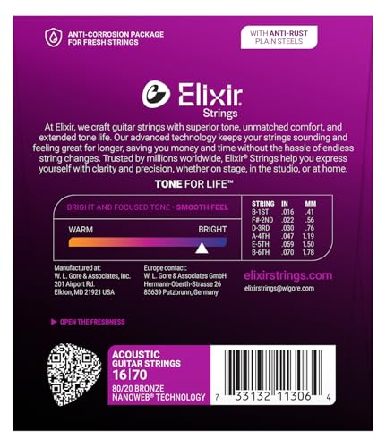 Product Description Elixir Strings are trusted by players worldwide from home to stage for their longest-lasting tone. Our advanced NANOWEB Technology protects the entire string, even the gaps between the windings from debris buildup that deadens your tone. Your strings will sound and feel better for longer, saving you money and time without the hassle of endless string changes. These premium acoustic strings, crafted with 80/20 bronze, deliver a bright, focused tone and crisp, vibrant presence with a smooth and comfortable feel. So every note you play resonates with clarity and precision to match your passion. From the Manufacturer Prolong your tone with the same acoustic guitar strings that experienced players worldwide trust to keep their incredible tone longer than any other string available.Unlike other string brands, Elixir Strings coats the whole string. This protects not only the outer string surface but also the gaps between the windings where common tone-deadening gunk typically builds up in other brands’ coated and uncoated guitar strings. Anti-Rust Plating on plain steel strings ensures longer tone life for the entire set.Who wouldn’t love more quality playing time between the hassle and cost of string changes?Premium by design, these acoustic strings constructed with 80/20 (80% copper, 20% zinc) bronze wrap wire boast a bright tone with an expressive, vibrant presence. Compared to our POLYWEB® Coating, the NANOWEB Coating feels more like a traditional string. For a slicker, faster feel, try the POLYWEB Coating on our 80/20 Bronze Acoustic Strings, which also feature a warmer and more robust tone. For more of a balance between bold and bright, our Phosphor Bronze Acoustic Guitar Strings with NANOWEB Coating deliver full-bodied tone and sparkling high-end clarity alongside the same traditional feel as these 80/20 bronze strings. Of course, the kind of string you play is all a matter of personal preference. Not sure what tone or feel is right for you? Try them out for yourself, and find your new favorite string from Elixir Strings.Elixir Strings: Great tone. Long life.