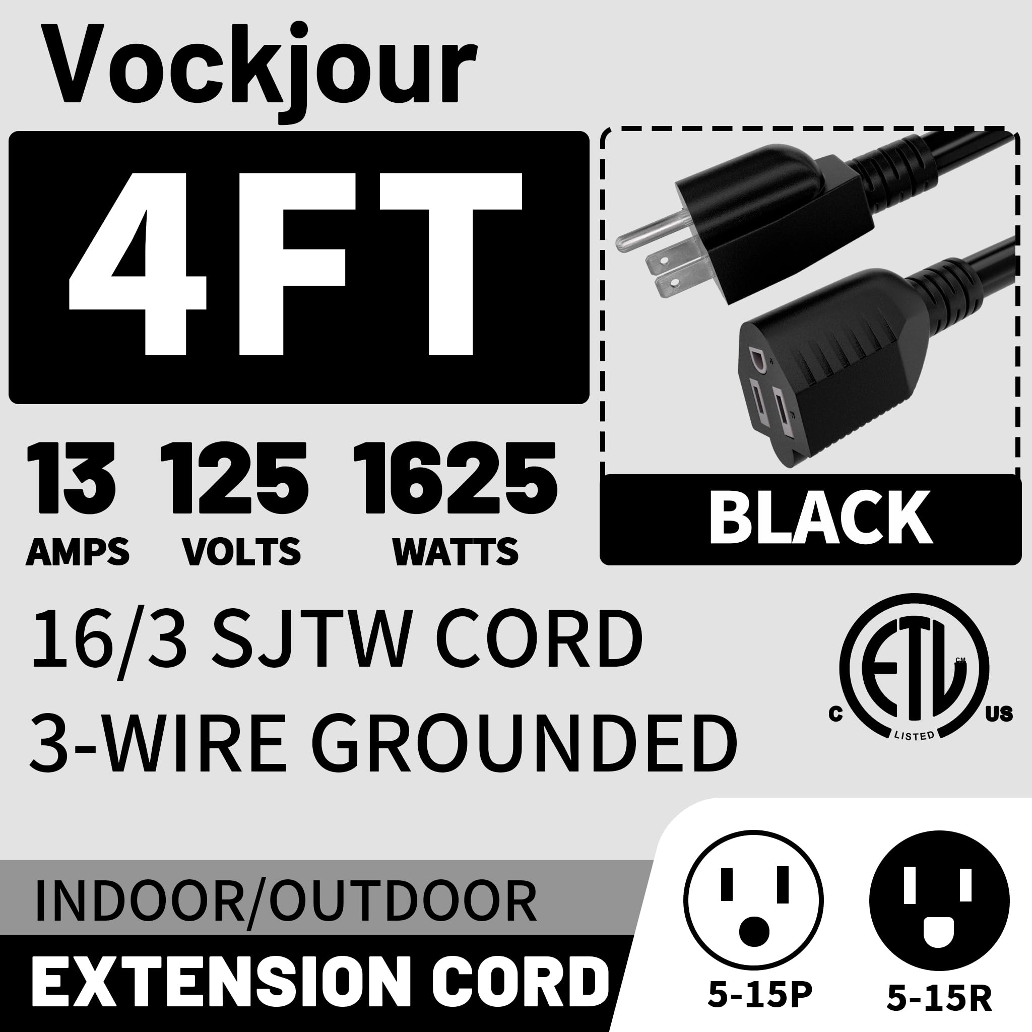 ETL Listed:16 AWG extension cord 4 ft, 125 volts, 13 amps, 1625 watts, 5-15P/R,3 prong extension cord Temperature Range -58°F to +158°F; Heavy duty extension cord ETL/cETL Approved