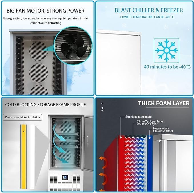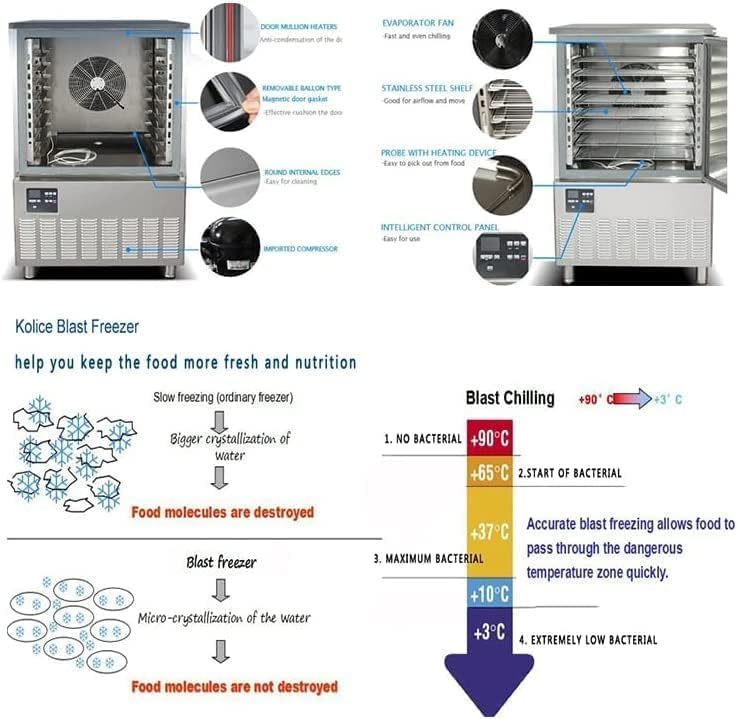 【Machine details】: Kolice Commercial Heavy Duty 15 Trays Shock Freezing Blast Chiller & Freezer comes with adjustable 15 pcs stainless steel trays, tray size: 23.62”x15.75”x1.10” (60x40x2.8cm), 220V 60HZ, single phase , 2700W. US plug. Temperature range: -40C to +5C (-40°F to +41°F), EVCO smart AI temperature controller, self-closing door with auto defrost and magnetic seal design, 90°door opening,stainless steel color,net volume: 370L, 3 inches thick of soft foam material insulation design to lock the temperature, around 78 inches long power cord.