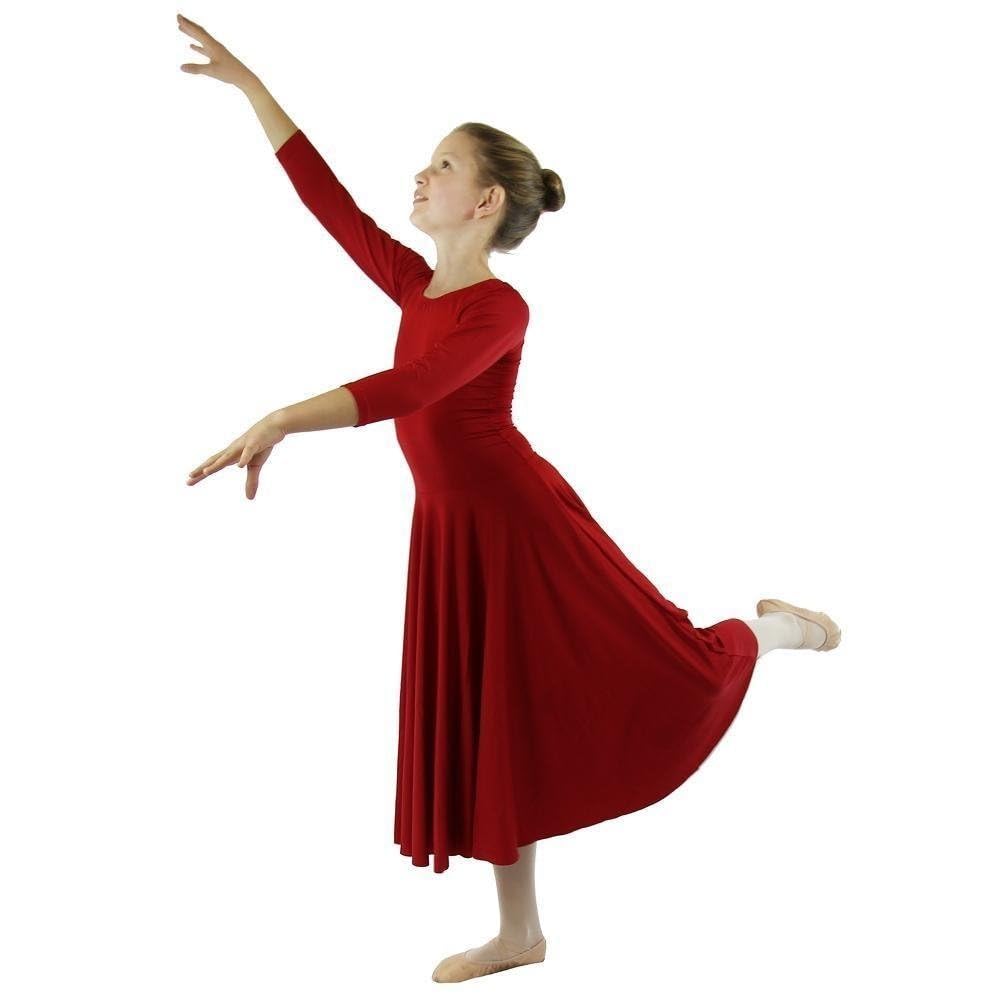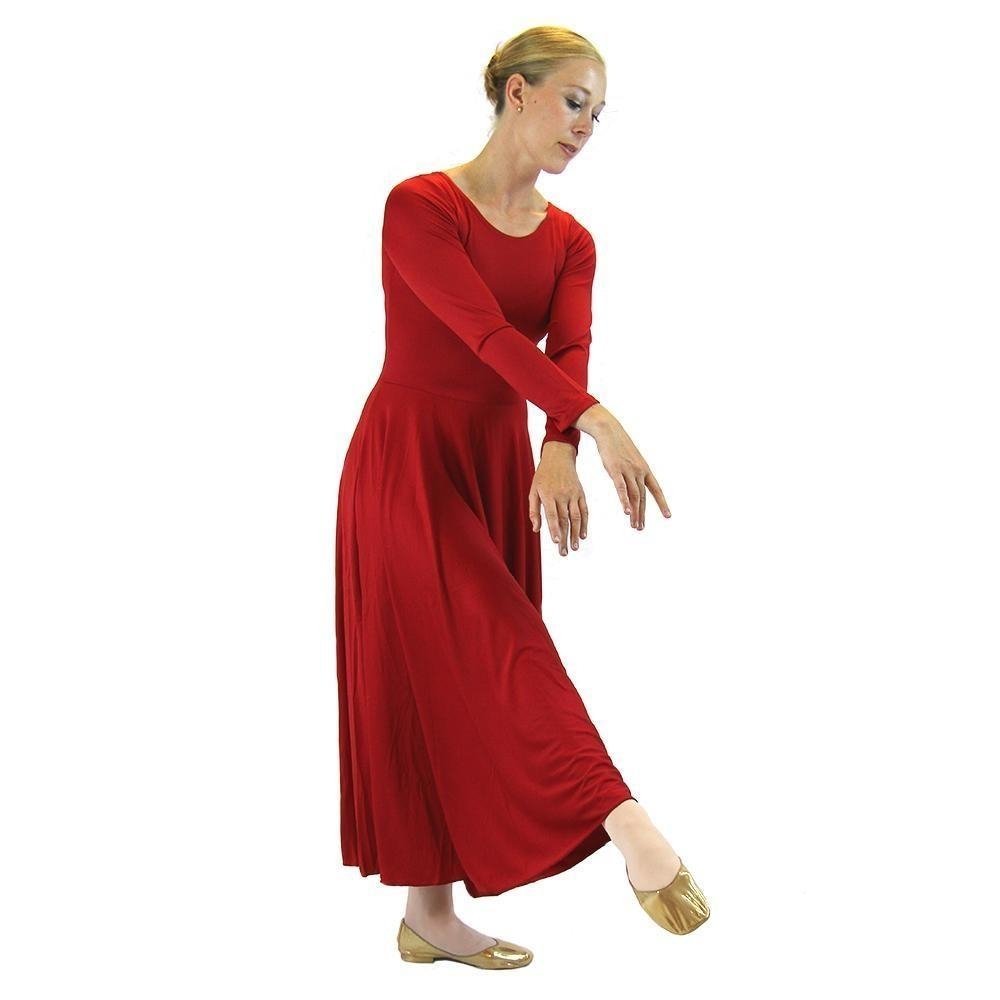 Description This is one of Danzcue's most popular dresses and features a soft and smooth polyester/spandex fabric that stretches and moves with you when dancing. The upper torso of this dress is slightly fitted to show the grace and beauty of movement. The skirt is long and full, which is very suitable for worship praise dance, modern liturgical dance, ceremonies, etc.