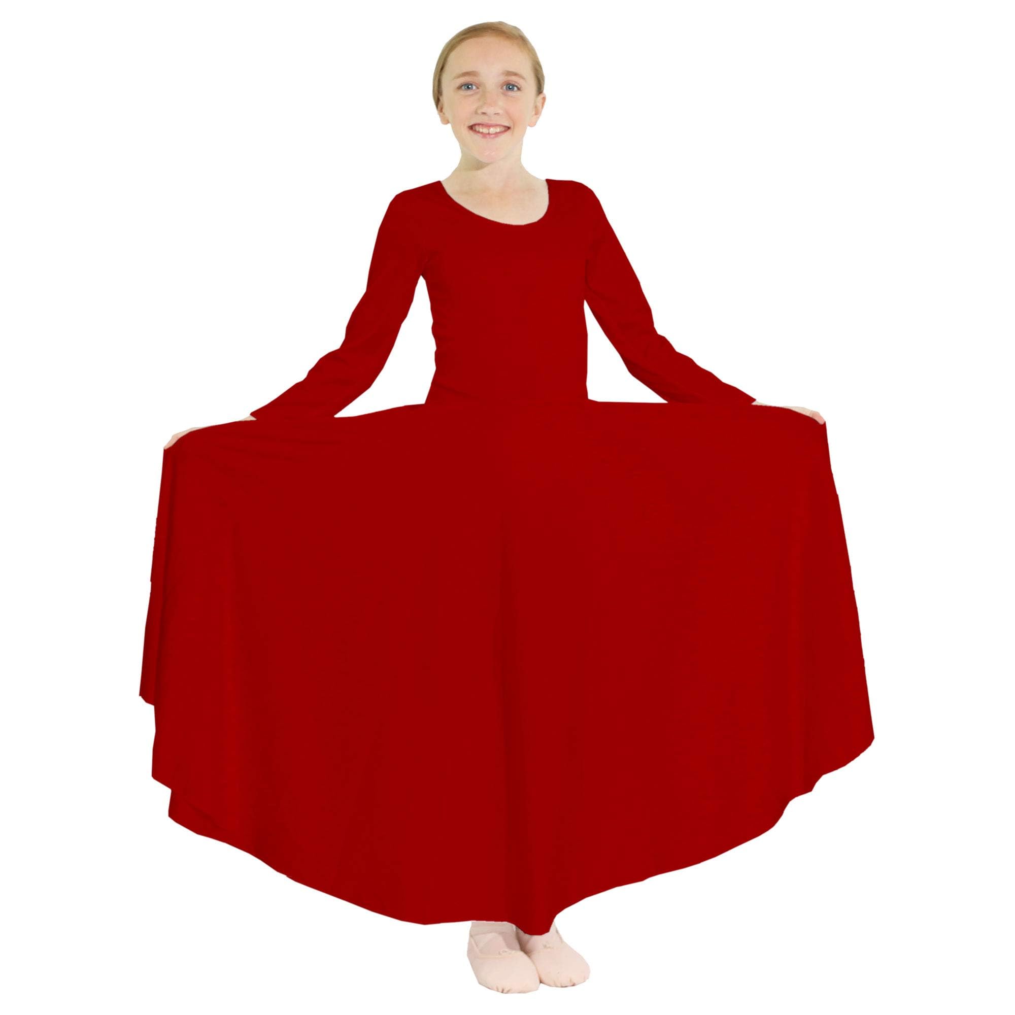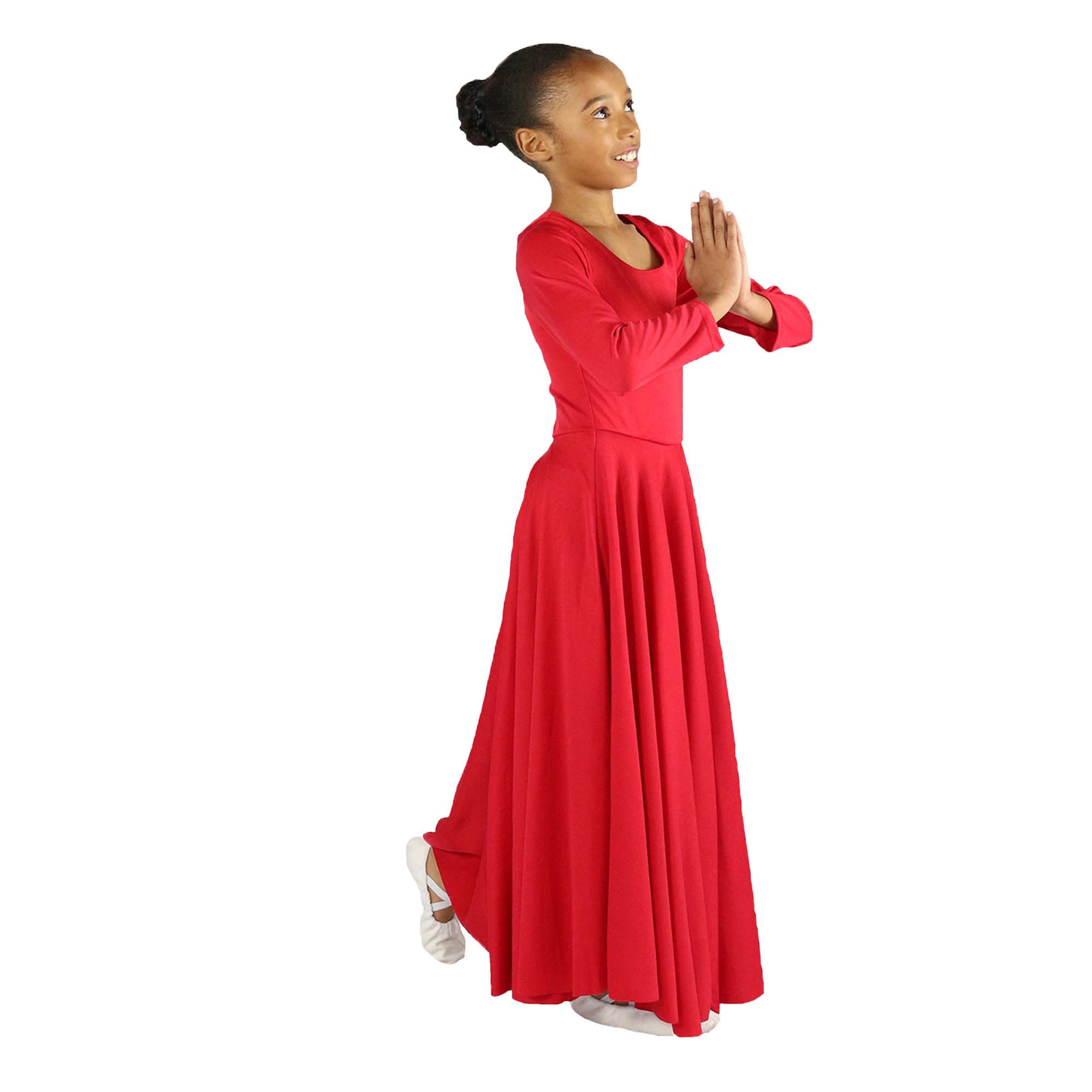 Praise Dance Dress for Girls: This girls praise dance dress is designed with a full-length, flowing skirt and long sleeves, offering a graceful and modest look perfect for worship performances, church events, and recitals. The round neckline adds to its simplicity and elegance.