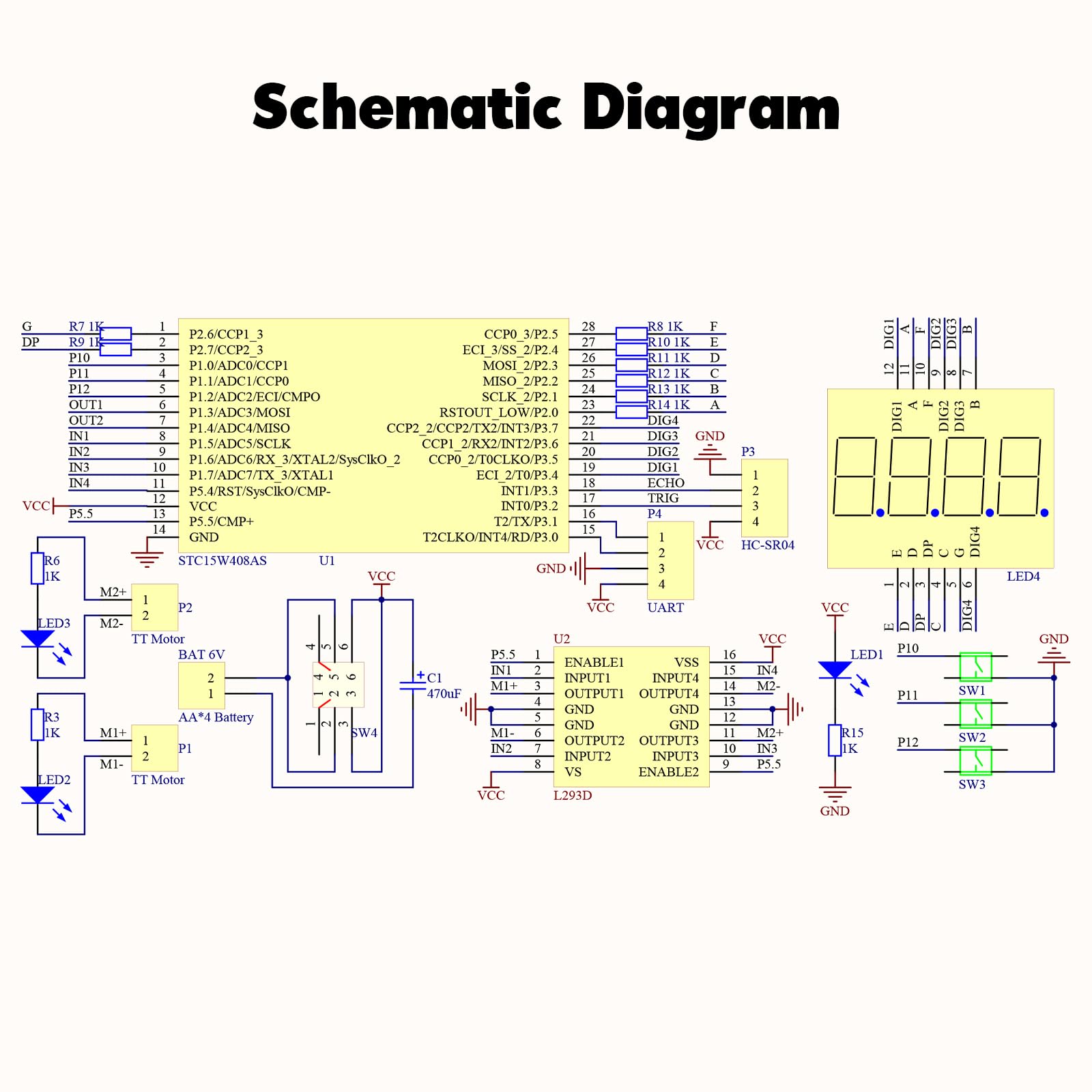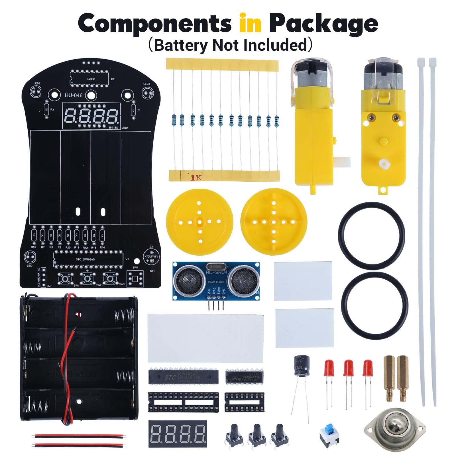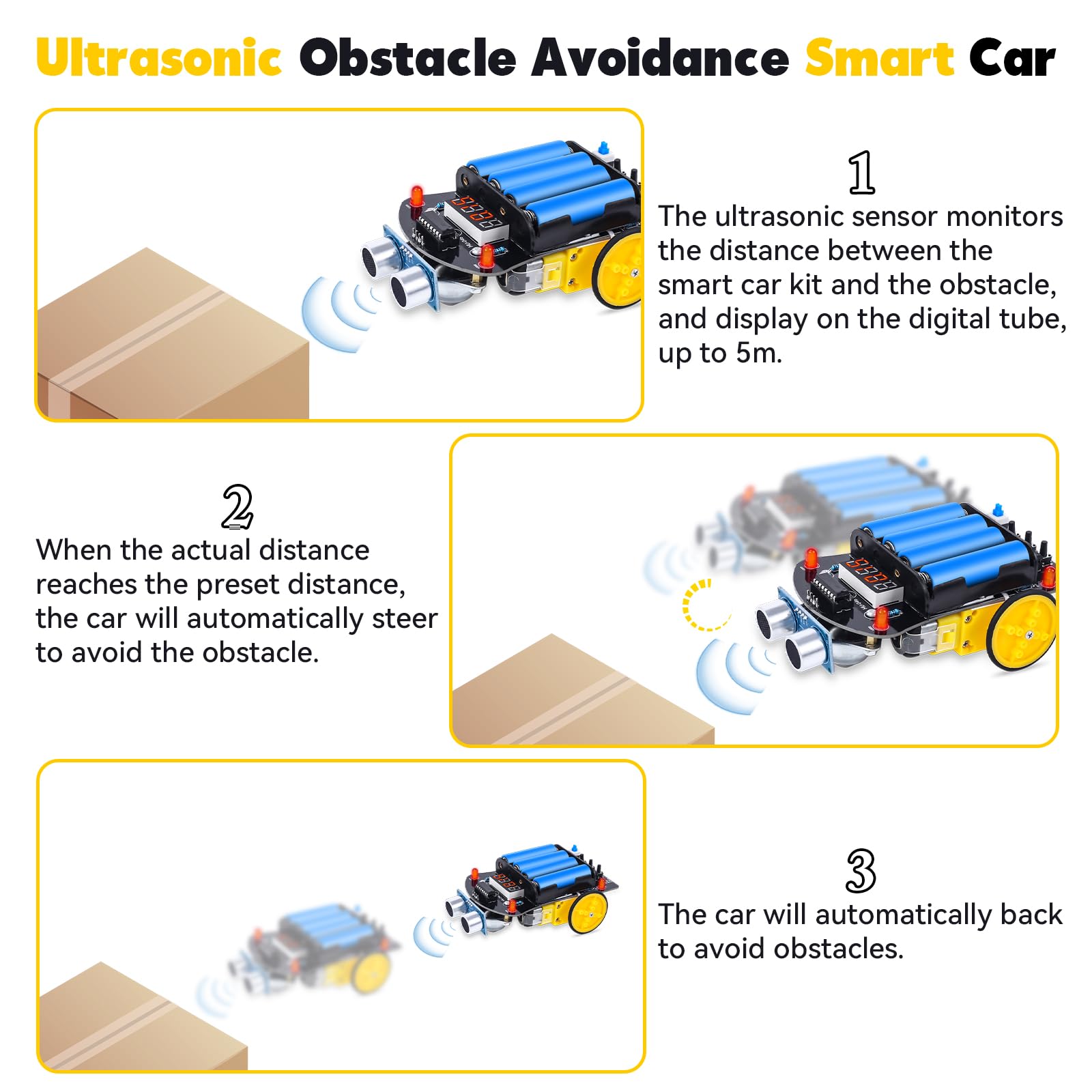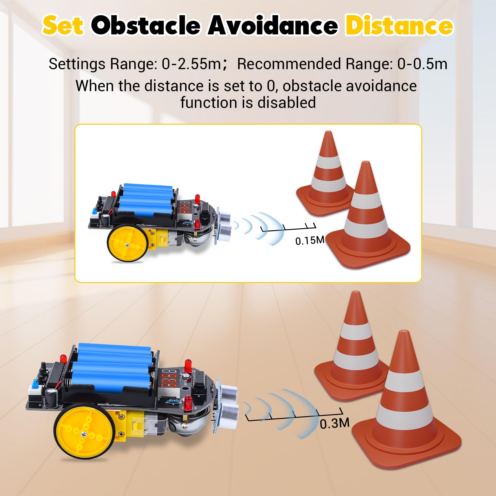 【Features & Functions】: The MiOYOOW Smart Car kit(Battery Not Included) has the capability to automatically retreat or rotate upon encountering obstacles. You can customize the obstacle avoidance range, with a range setting of 0-2.55m and an optimal range of 0-0.5m. Additionally, the front digital tube displays real-time obstacle distance, up to 5m.