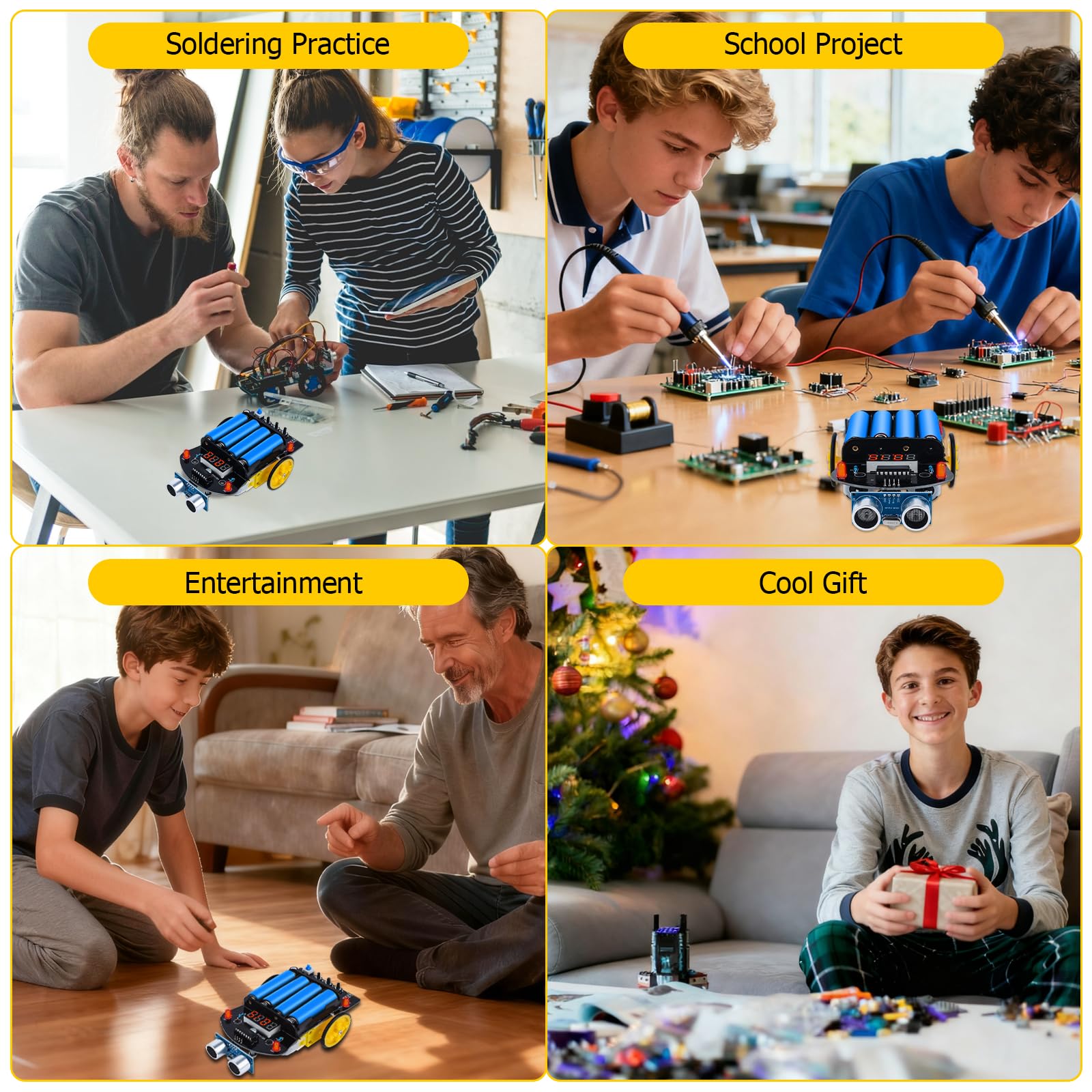 【School Science Project】: The Smart Robot Car is a highly sought-after educational resource in schools, purpose-built to facilitate students' acquisition of fundamental knowledge in mechanical engineering, electronics, sensor technology, automated control, and soldering methodologies. This kit encourages students to explore and understand various interdisciplinary concepts, fostering a strong foundation in STEM education.