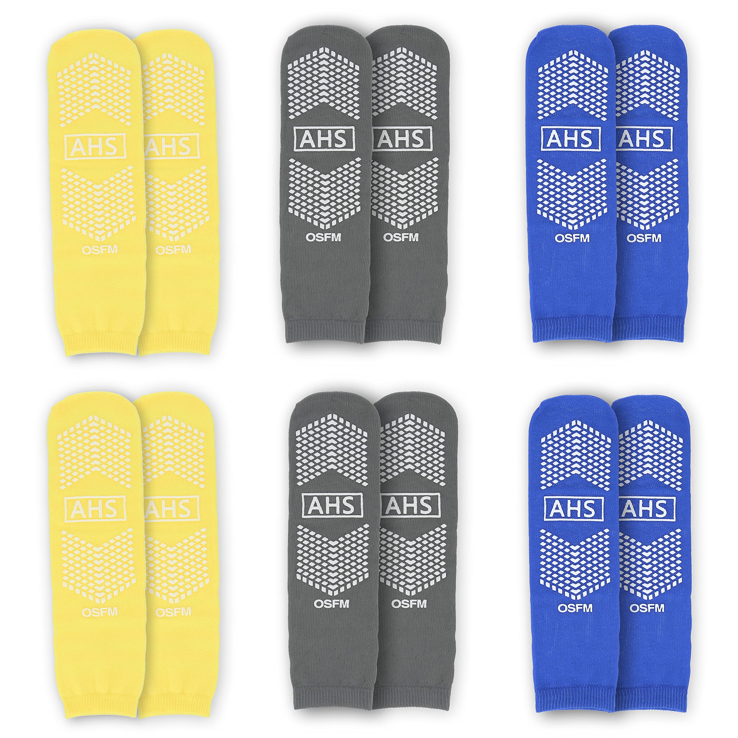 Product Specifications: The Hospital Slipper Socks are available in a single size that fits most. The pack of 6 pairs comes in assorted color socks with 2 blue pairs, 2 yellow pairs and 2 gray pairs.