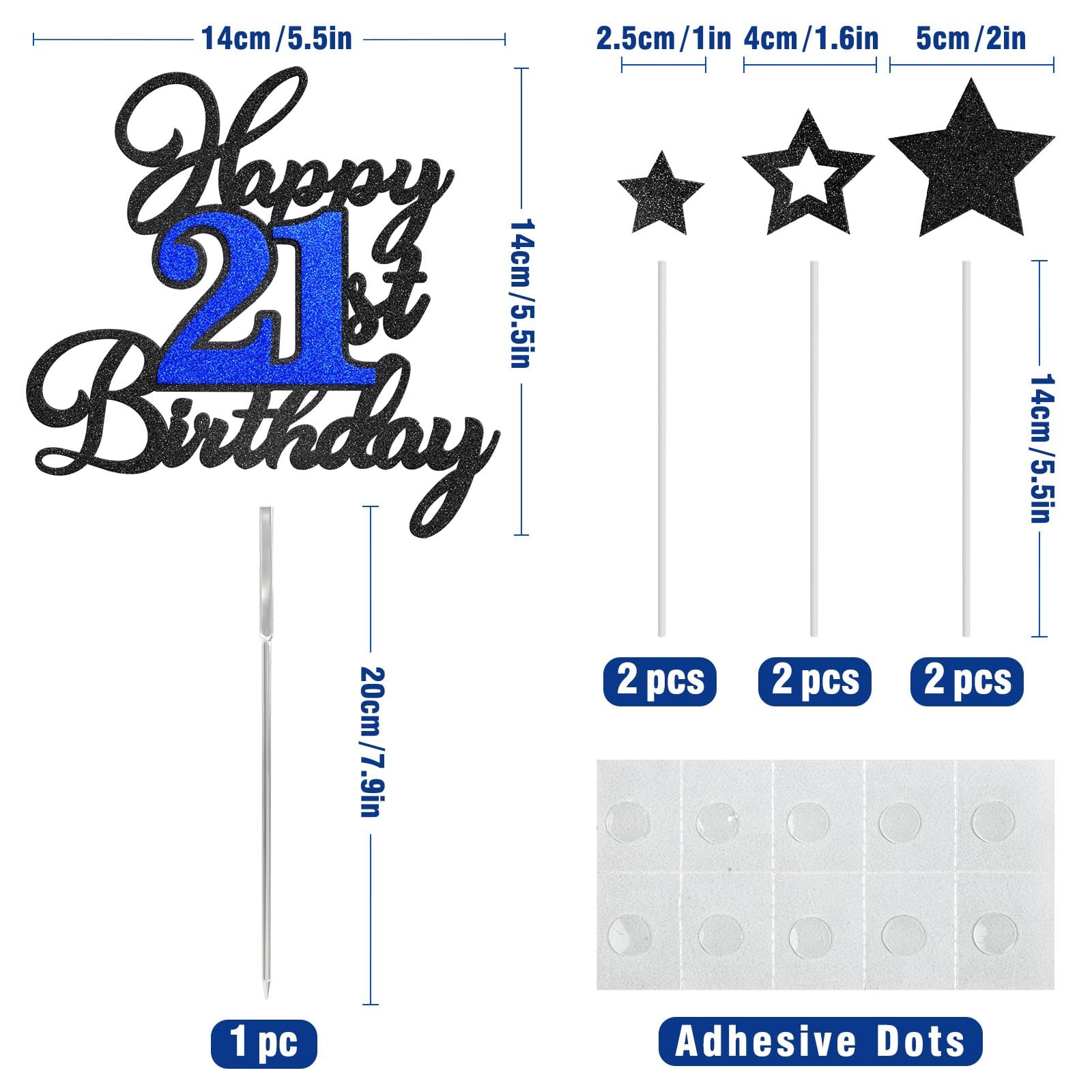 Package Included: 1Pc Happy 21st Birthday cake topper, 6 pcs stars,1 pc Food-Grade clear plastic stick, 6 pcs white plastic sticks, 10 pcs adhesive dots. It's a wonderful addition to the birthday party and anniversary party.