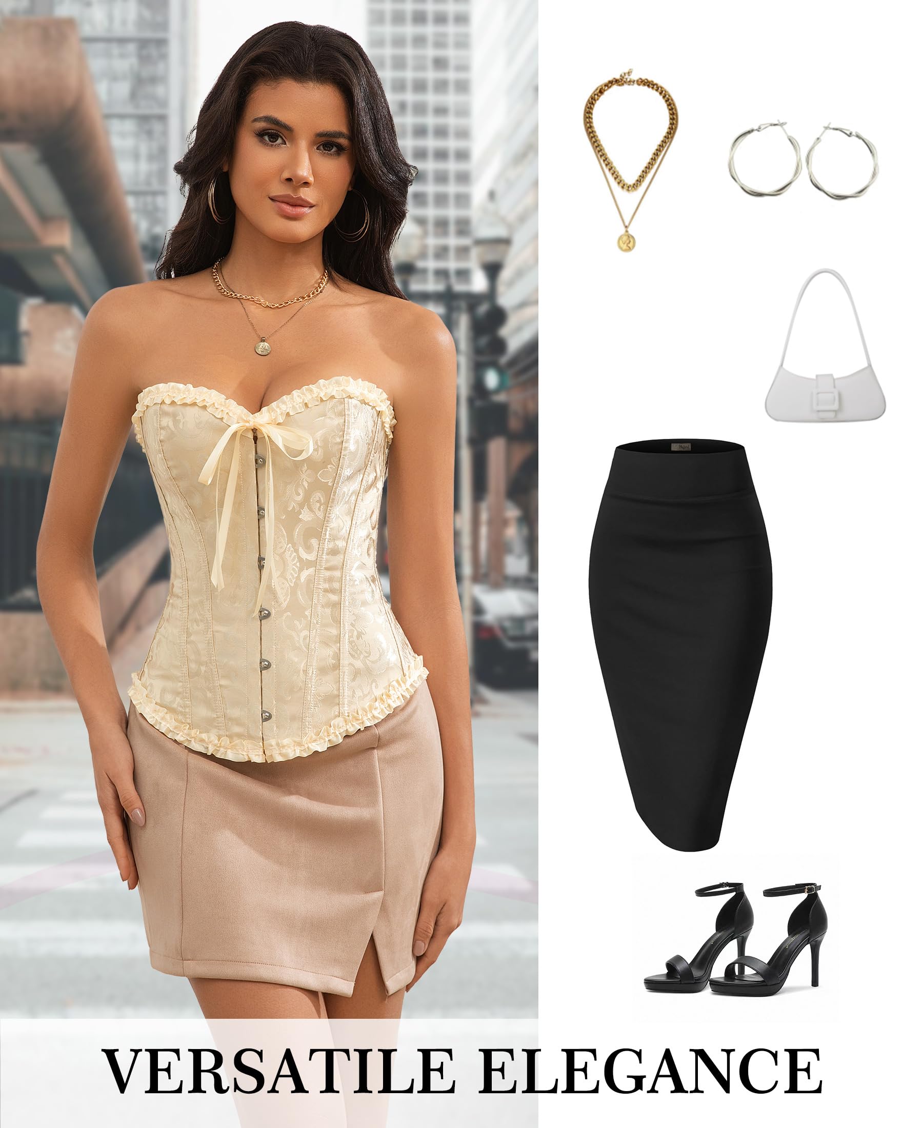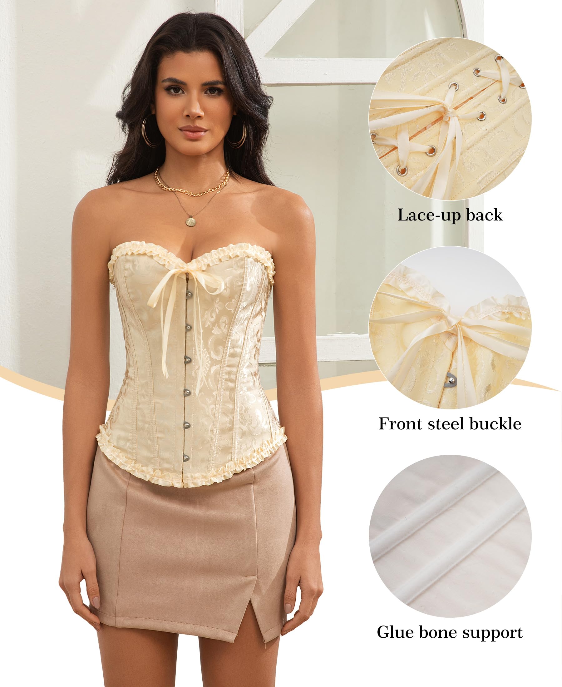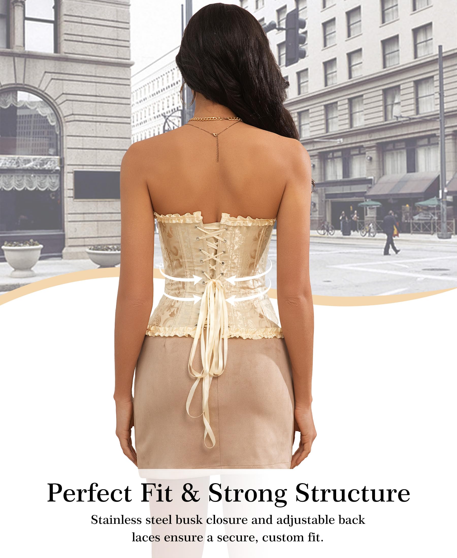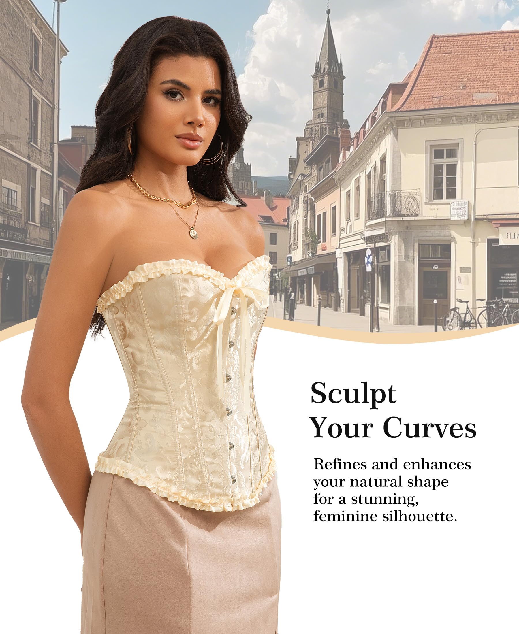 ALL DAY COMFORT: Our overbust corset top is a harmonious blend of comfort and elegance, made with materials that caress your form while ensuring freedom of movement. The waist corset unique 12 plastic bone structure is engineered to support an upright posture, reducing back strain. Designed for wearability from dawn until dusk, the waist cincher corset is the ideal everyday companion. Our lace corset top aligns with your body's needs and your heart's desires