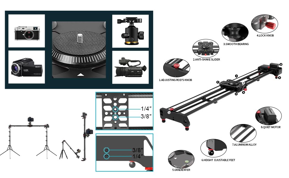 【Equipped with multiple 1/4-inch and 3/8-inch screw holes】The electric camera slide is equipped with multiple 1/4-inch and 3/8-inch screw holes, which can be installed on most tripods. The screw holes can be used to shoot vertically, horizontally and at 45 degrees. The slide comes with a ball head, which allows you to easily adjust the tilt and rotation position of the camera. The slide has a built-in bubble level for checking the balance of the camera.
