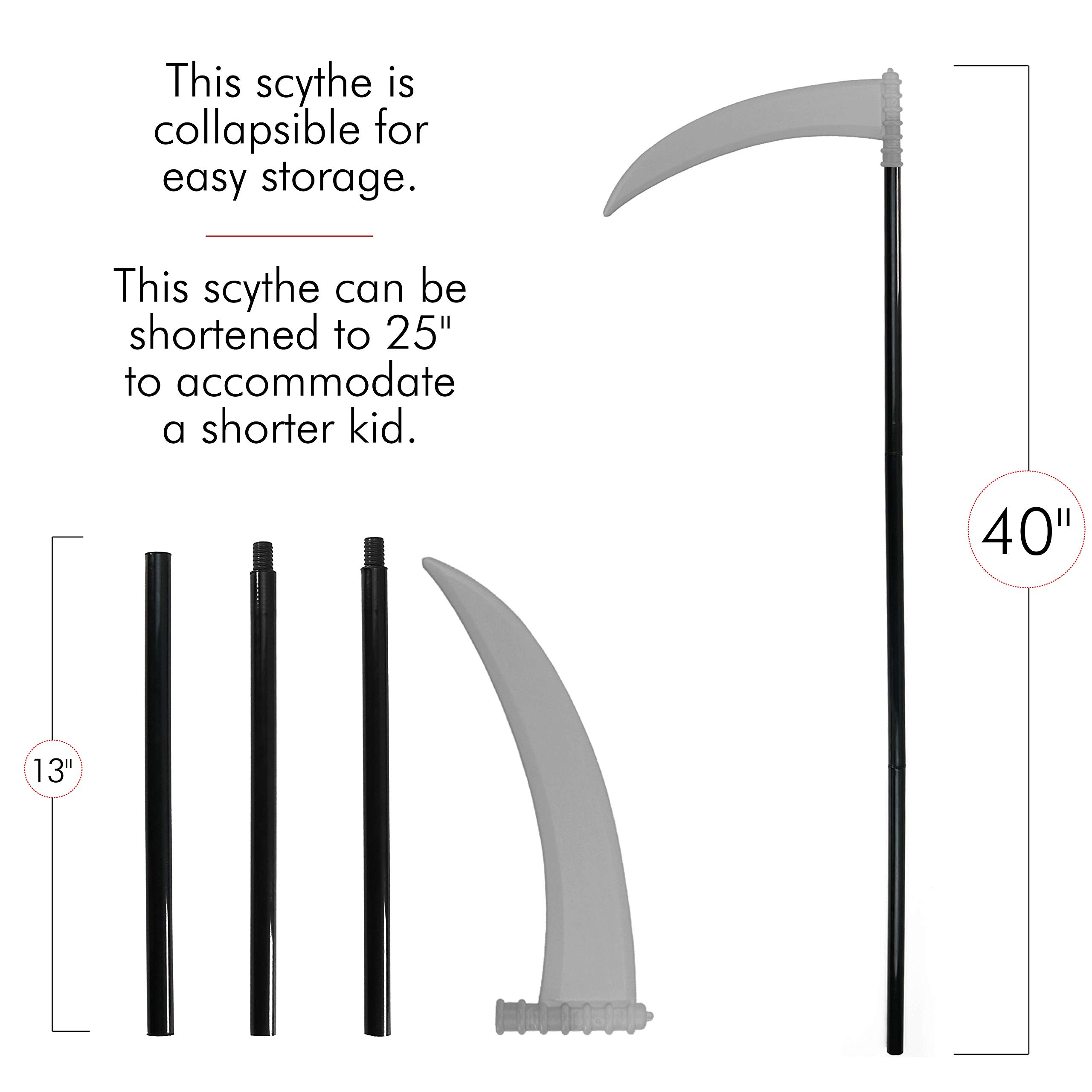 When expanded, the scythe is 41" tall, but it can be shortened to 28" to accommodate a shorter kid.