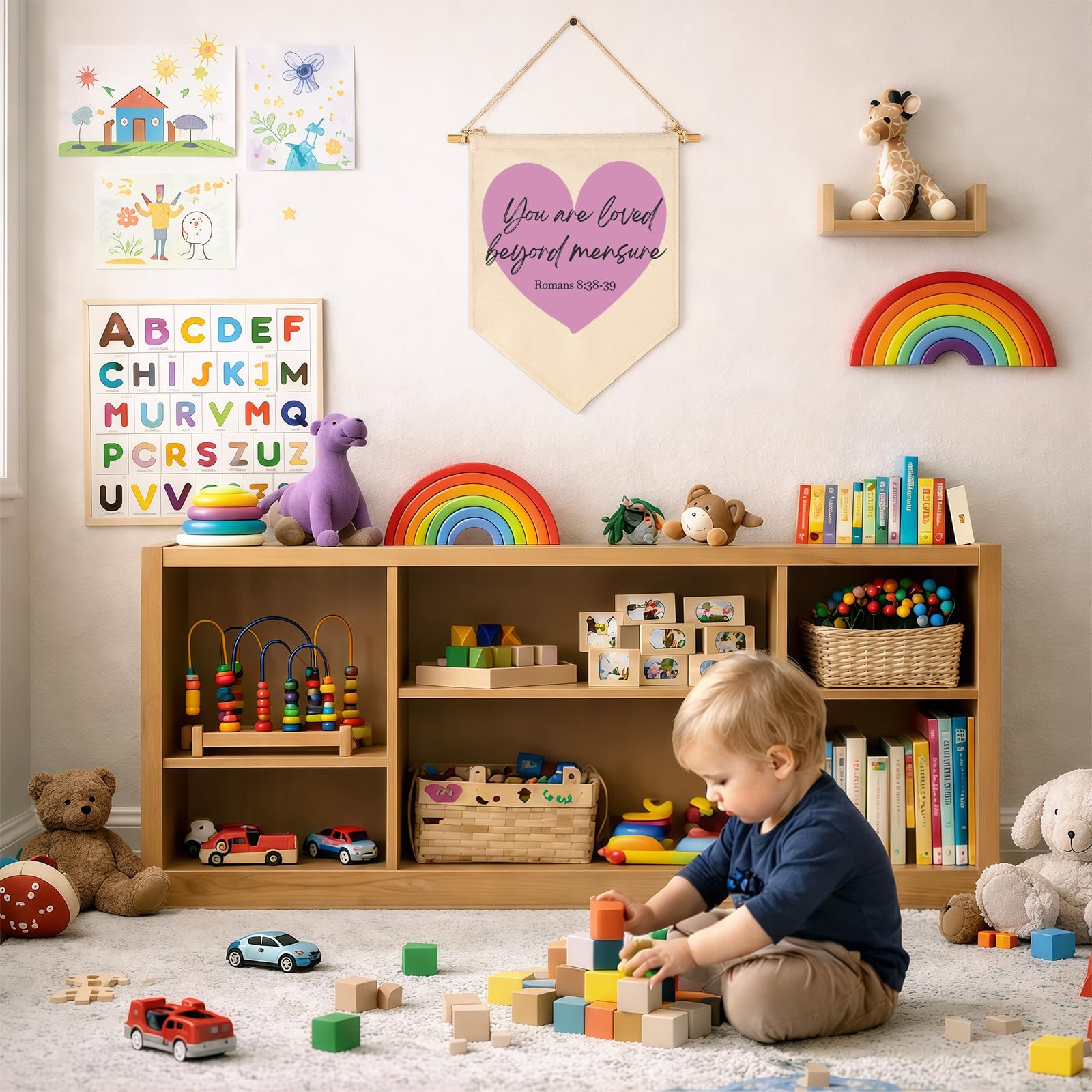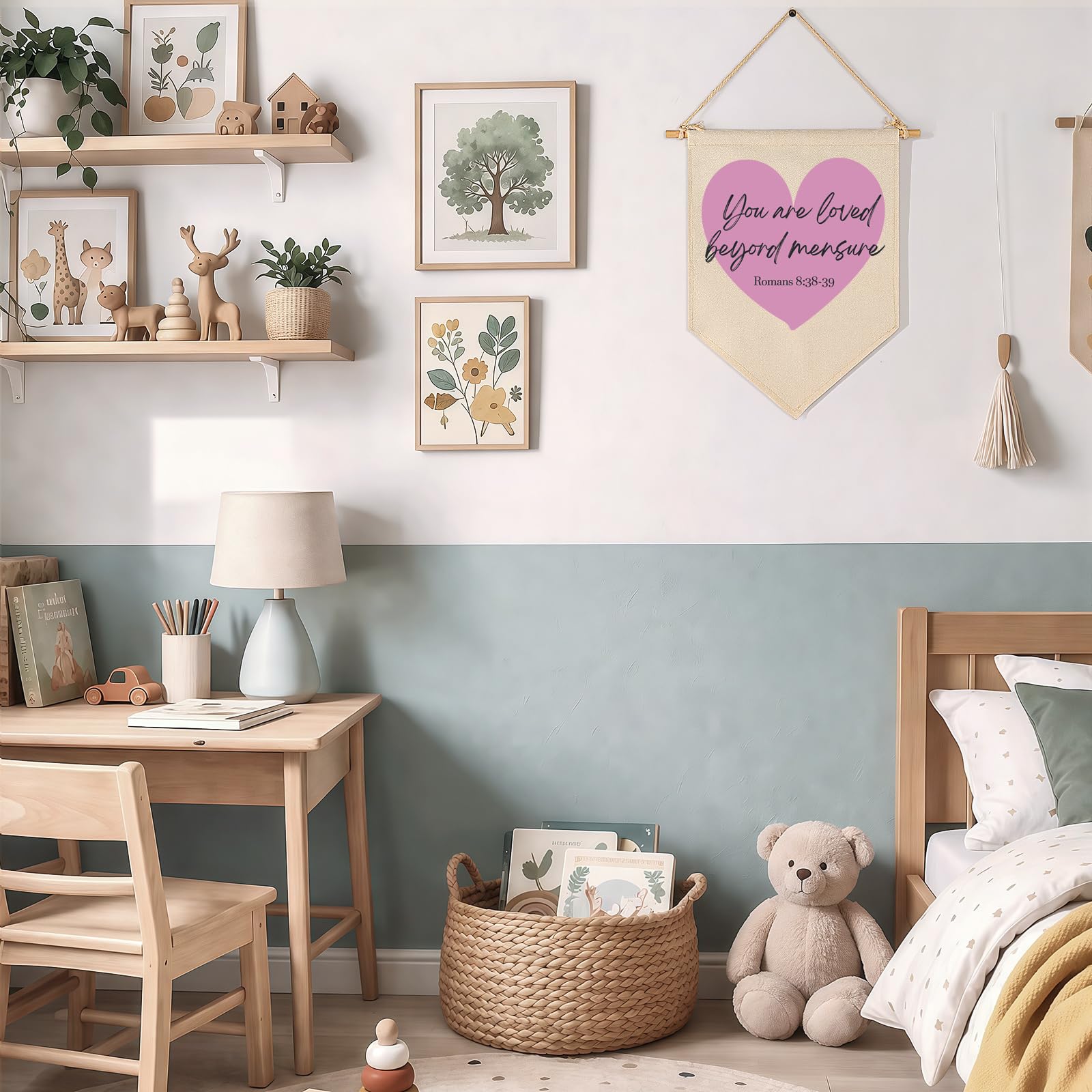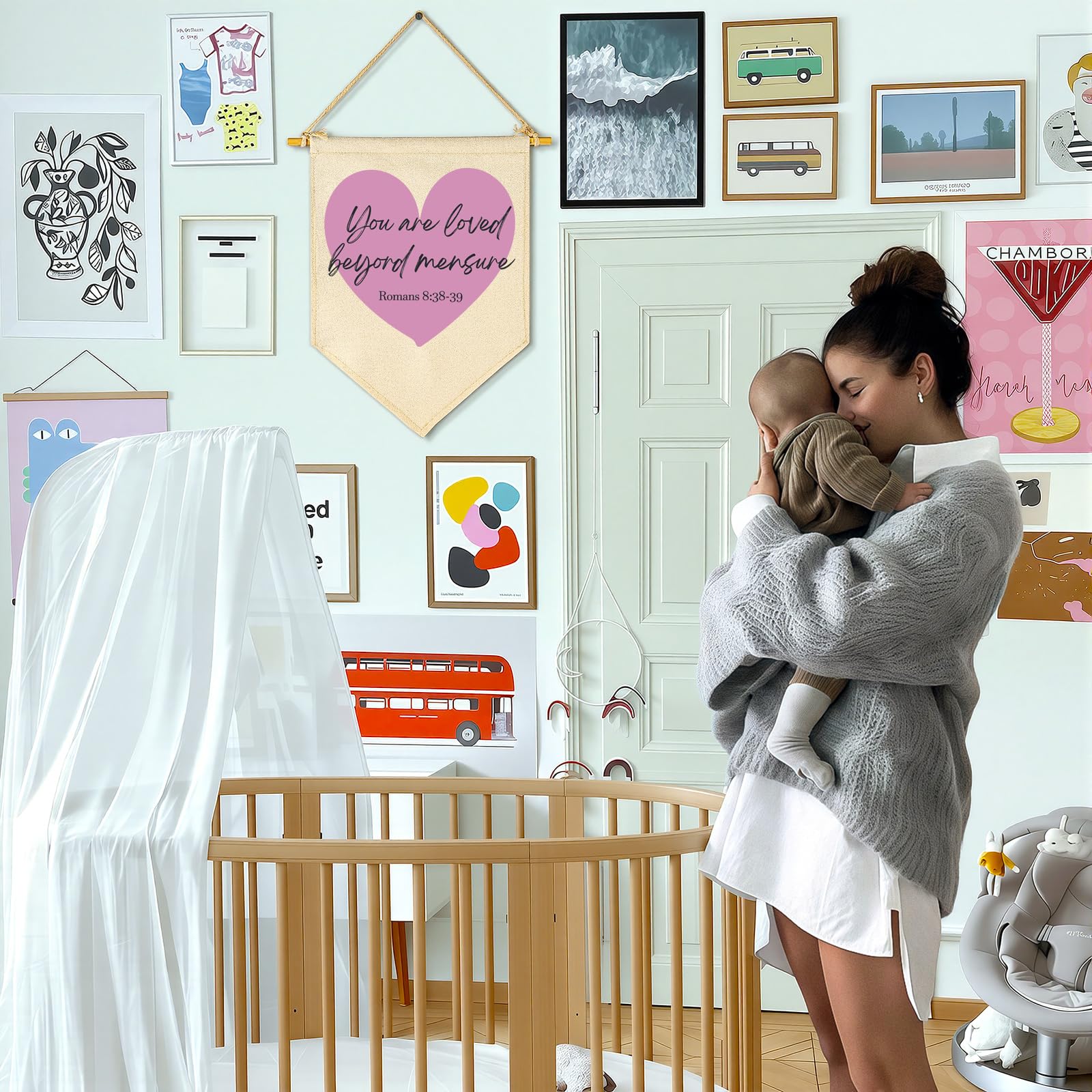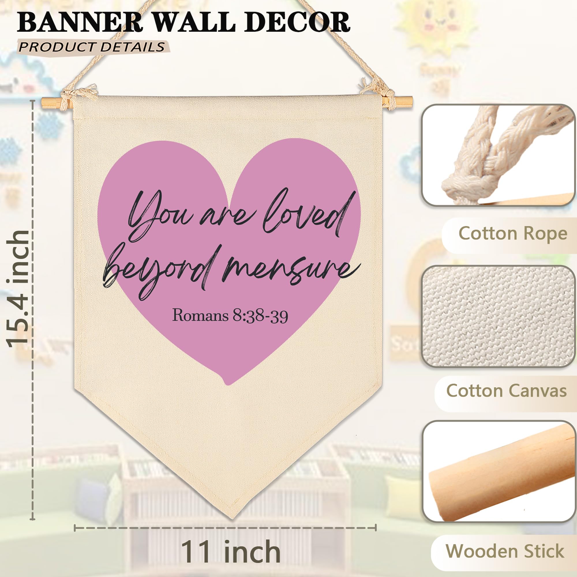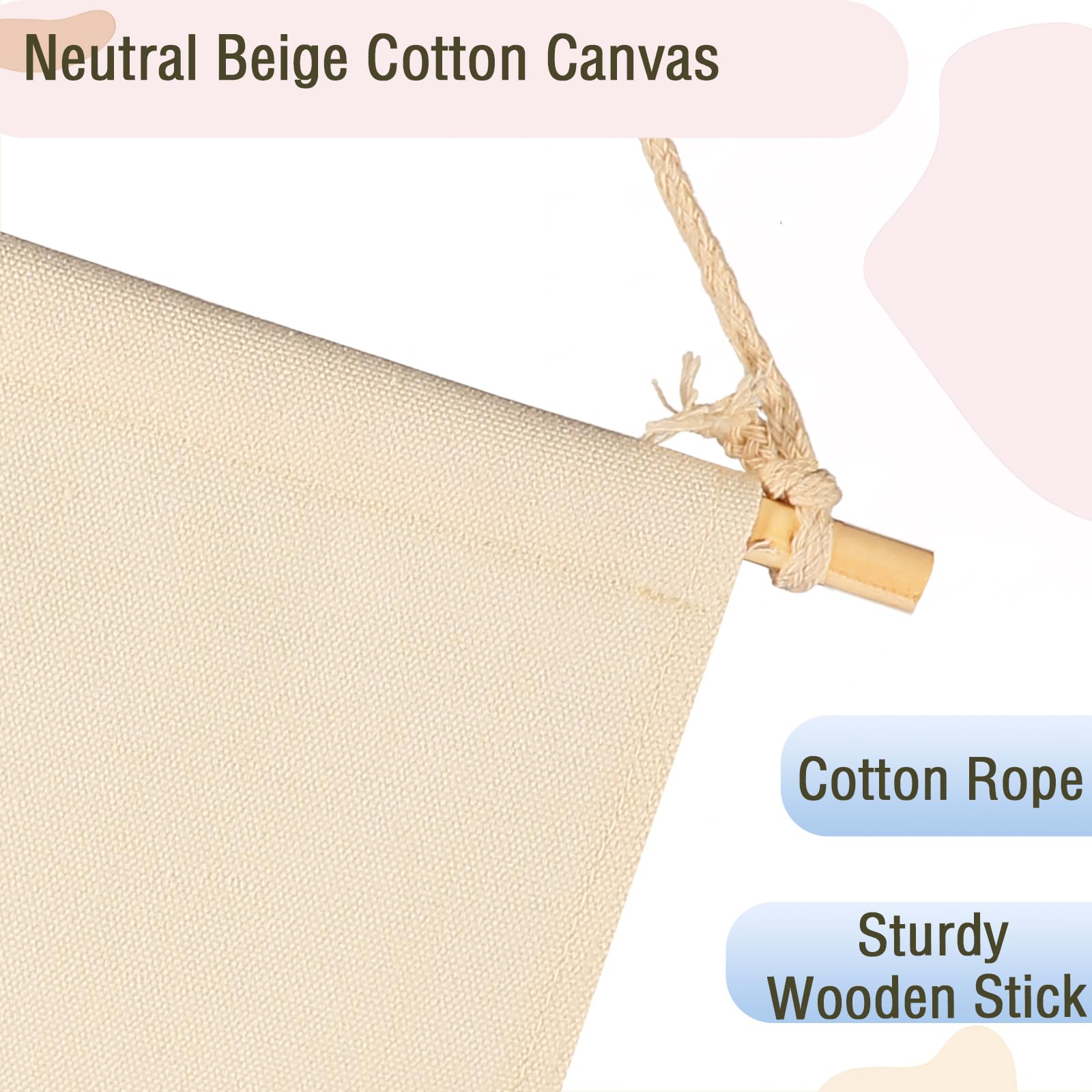 Crafted from natural cotton canvas, this 15.4 x 11 inch nursery wall banner brings a soft and calming touch to baby room, above crib or toddler space. The durable fabric keeps its shape with a natural texture, while the clear print stays bright with everyday use. Lightweight and easy to hang, it comes with a wooden dowel and pre-tied twine for quick setup on walls, doors or shelves. The versatile size fits small spaces without feeling crowded, making it perfect for creating a cozy nursery atmosphere. A thoughtful gift for baby showers, newborn arrival or first birthday.