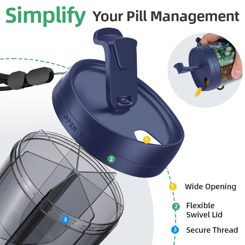 Easy to Access and Load Pills: The pill container adopts a smooth thread and lid that can swivel flexibly, and the wide opening is user-friendly for pill access. With the above 3 thoughtful and unique designs, the large pill organizer makes filling and taking medications effortlessly