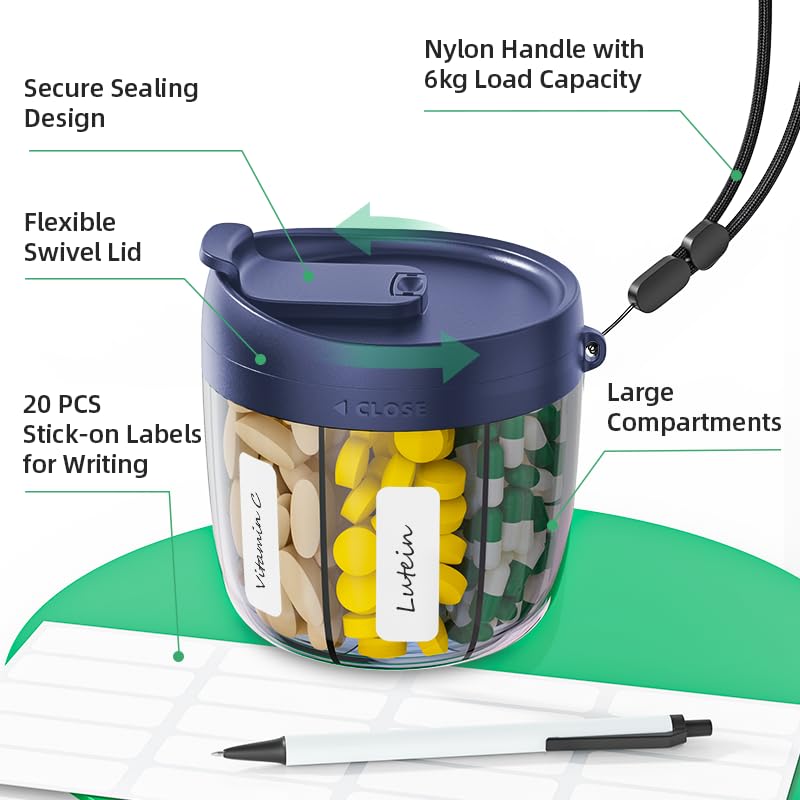 Portable Pill Holder for Travel: The travel medicine organizer has a quality nylon handle strap with a 6kg load capacity, making it easy to carry around. It comes with 20 blank stickers to help you record pill details and take pills on time according to dosage when traveling. The supplement organizer bottle is your ideal travel assistant