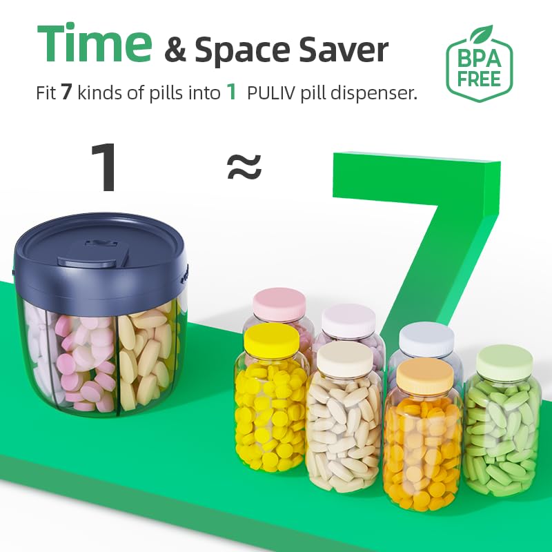 Hold 7 Supplements in 1 Bottle: The PULIV pill organizer weighs just 5.4 ounces and features 7 large compartments. Each compartment can hold up to 18 fish oils to meet your health needs easily, and each fish oil measures 0.9" in length. It has a height of 3.8" with a lid diameter of 3.6" and a base diameter of 3.0". Store 7 different supplements in the 1 pill bottle. Your ideal time and space saver