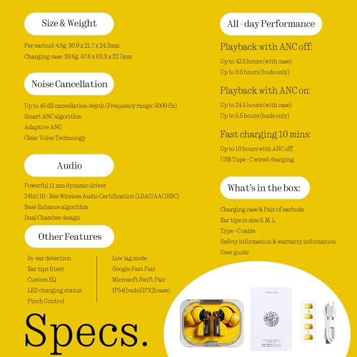 45 dB Smart Active Noise Cancellation: Nothing Ear (a) earbuds continuously monitors the seal between the earbud and your ear canal. If noise leakage is detected, it instantly adjusts the cancellation intensity to compensate—ensuring you always get the fullest possible noise reduction. Every time you put them in, they adapt. Move from a quiet room to a busy street without hearing a thing besides your audio.